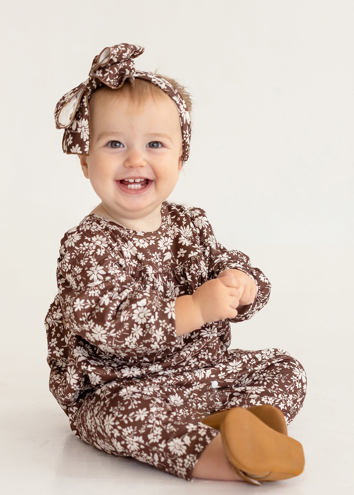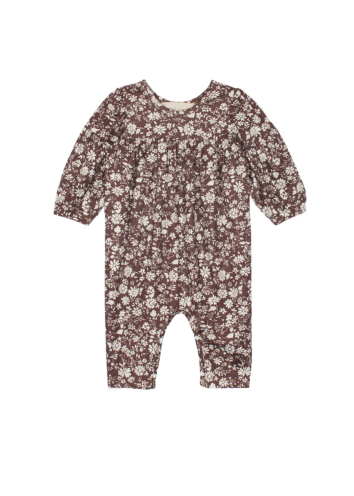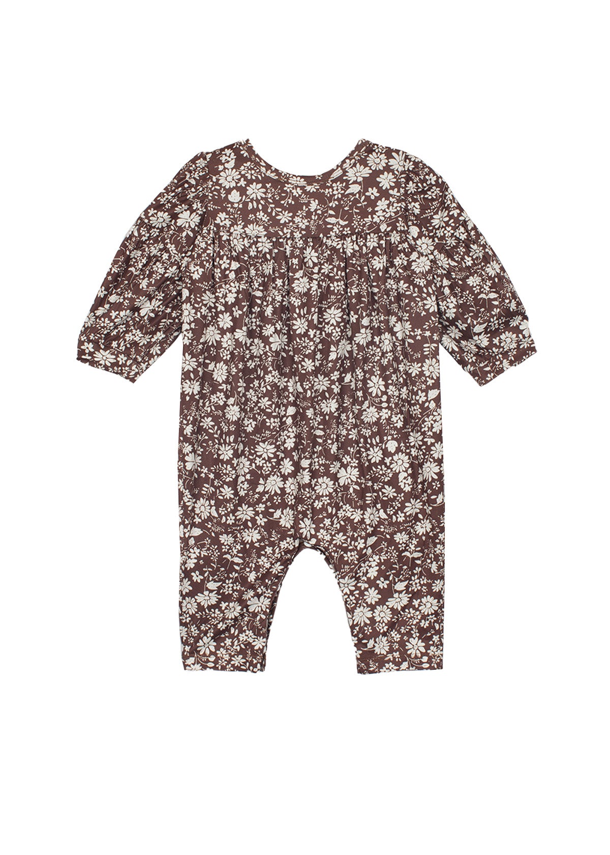 Snuggle up your little one in the Hot Chocolate Romper, adorned with a charming white floral print on a deep chocolate base. This romper, crafted from ultra-soft, stretchy cotton fabric, features an empire waistline detail and a comfortable fit for all-day play.