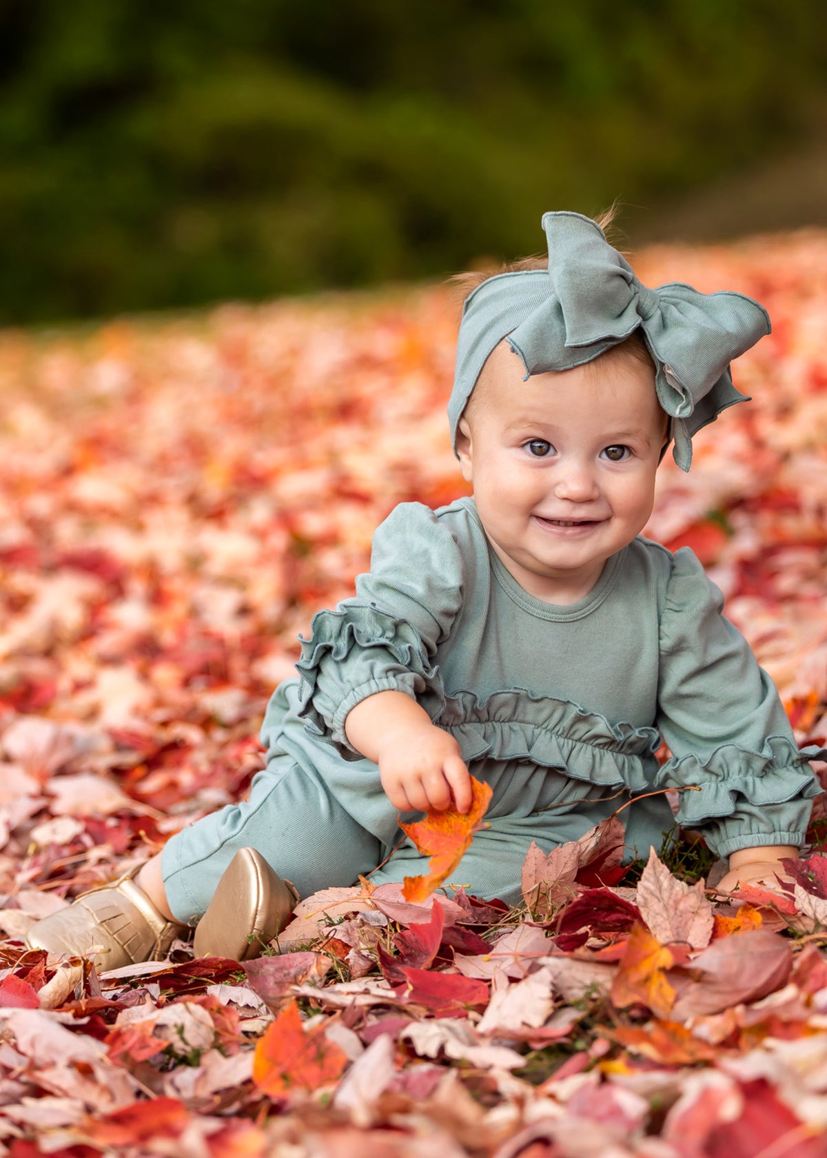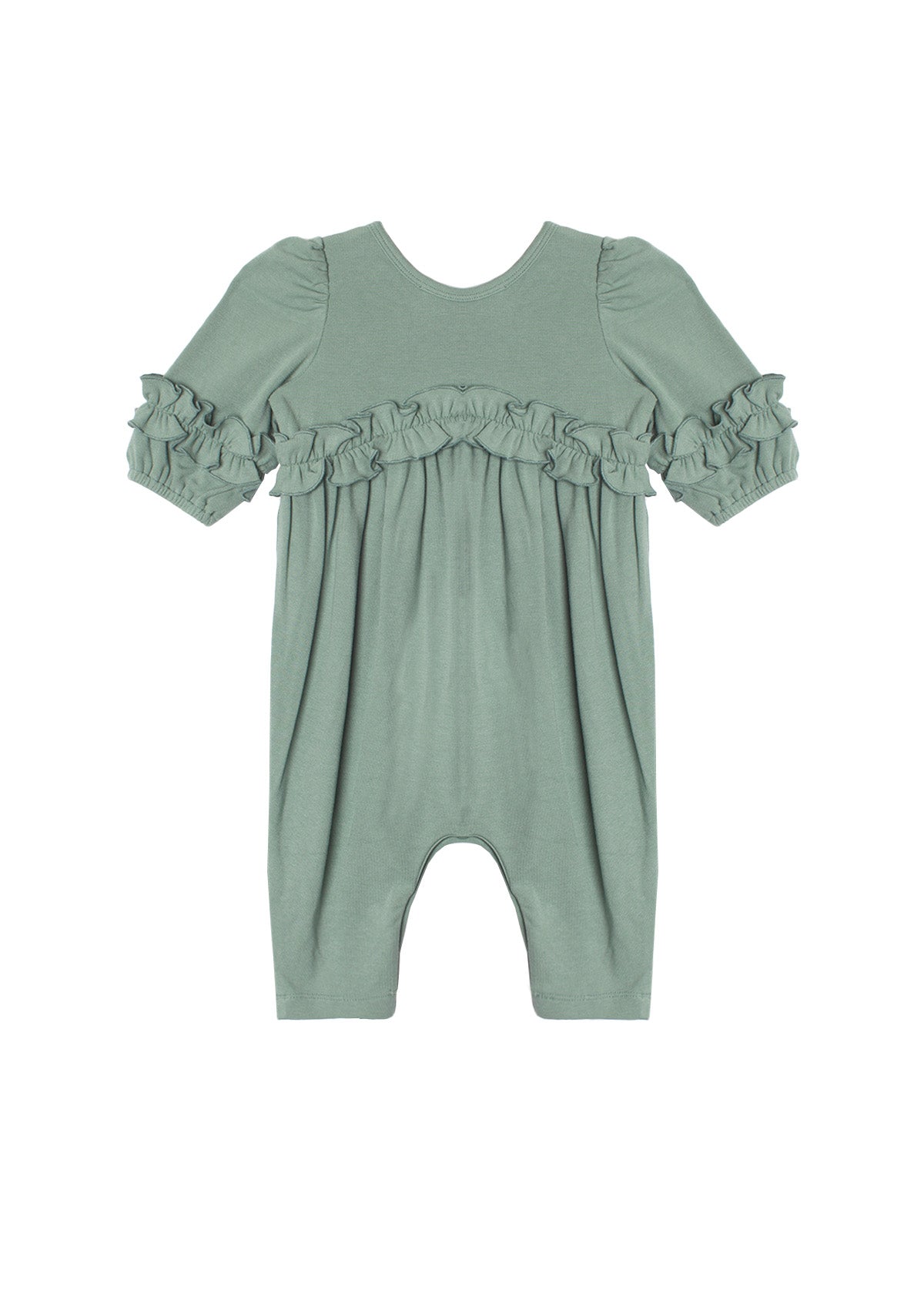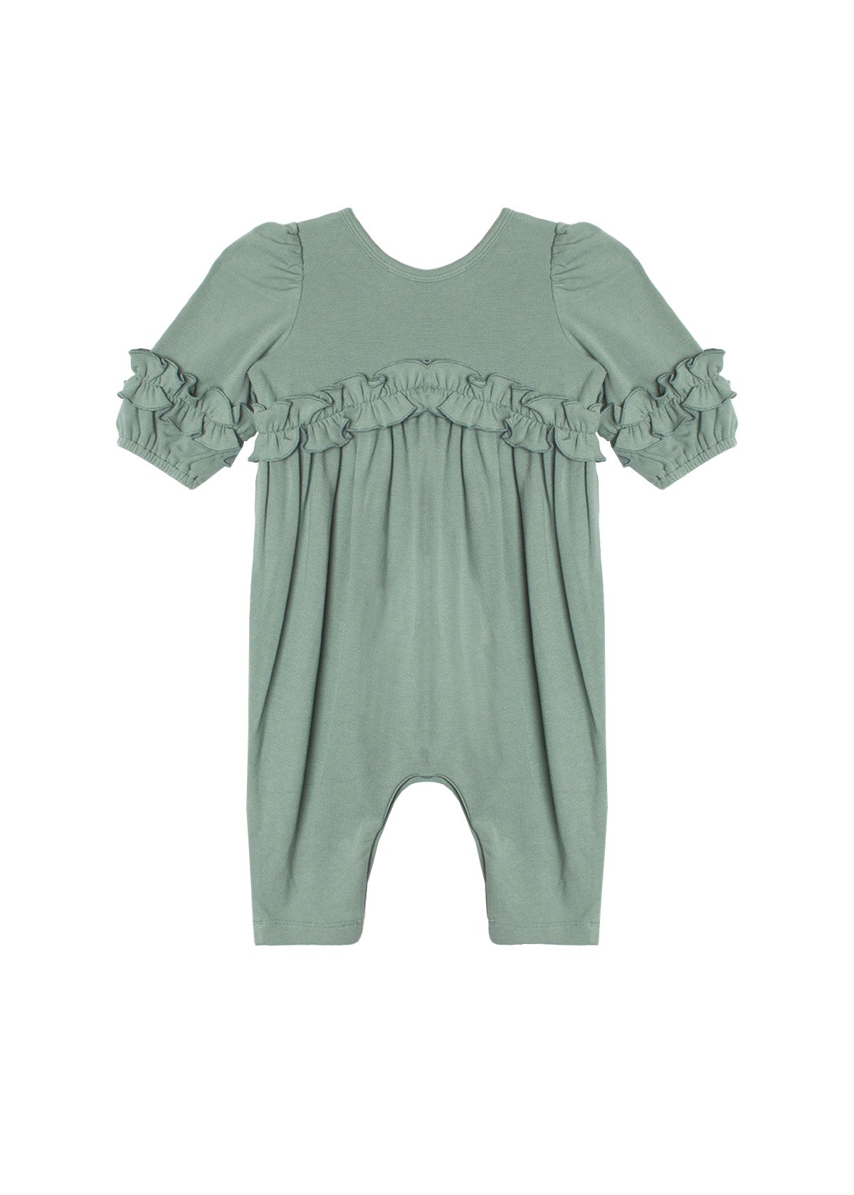 This adorable green romper features buttery soft fabric while ensuring ease of movement.The charming ruffle sleeves and a sweet ruffled natural waistline, each detail adds a playful touch to this cute ensemble.