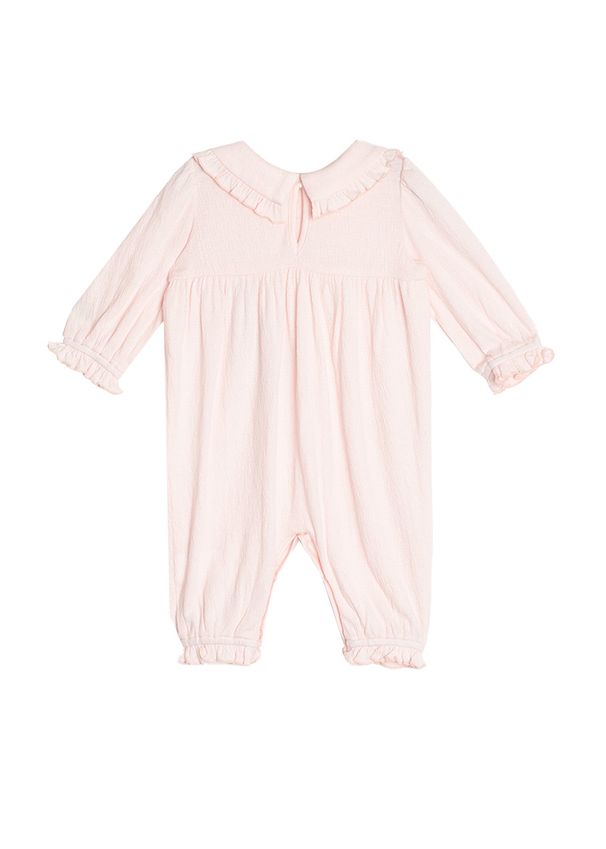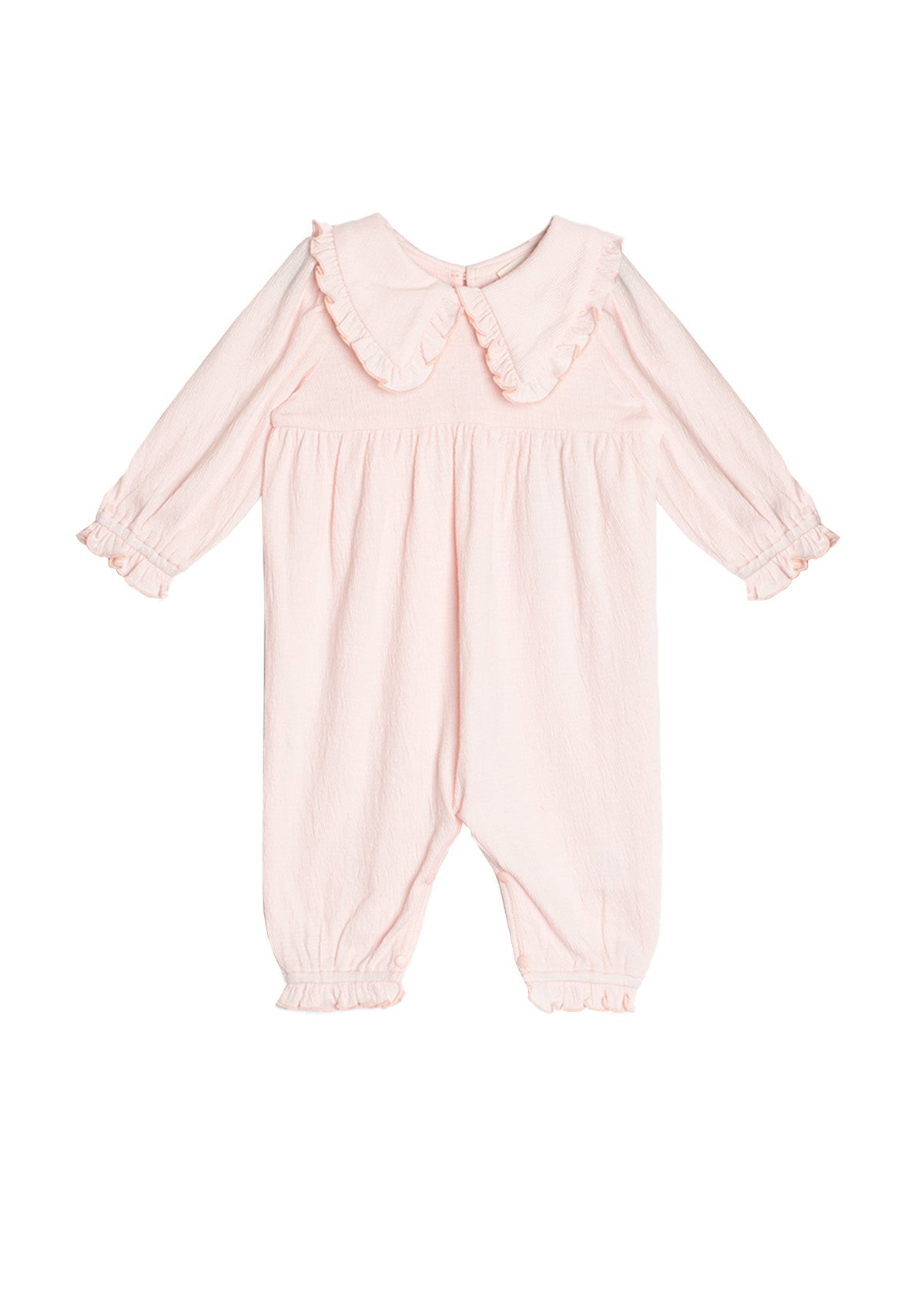 Made from a soft, textured fabric, this piece is as comfortable as it is cute. Featuring an empire waistline and delightful ruffle details on the collar and cuffs, it's designed for both style and ease of movement.