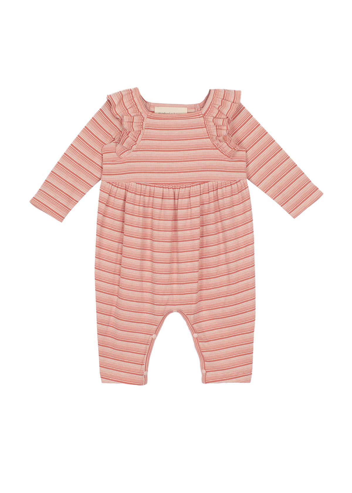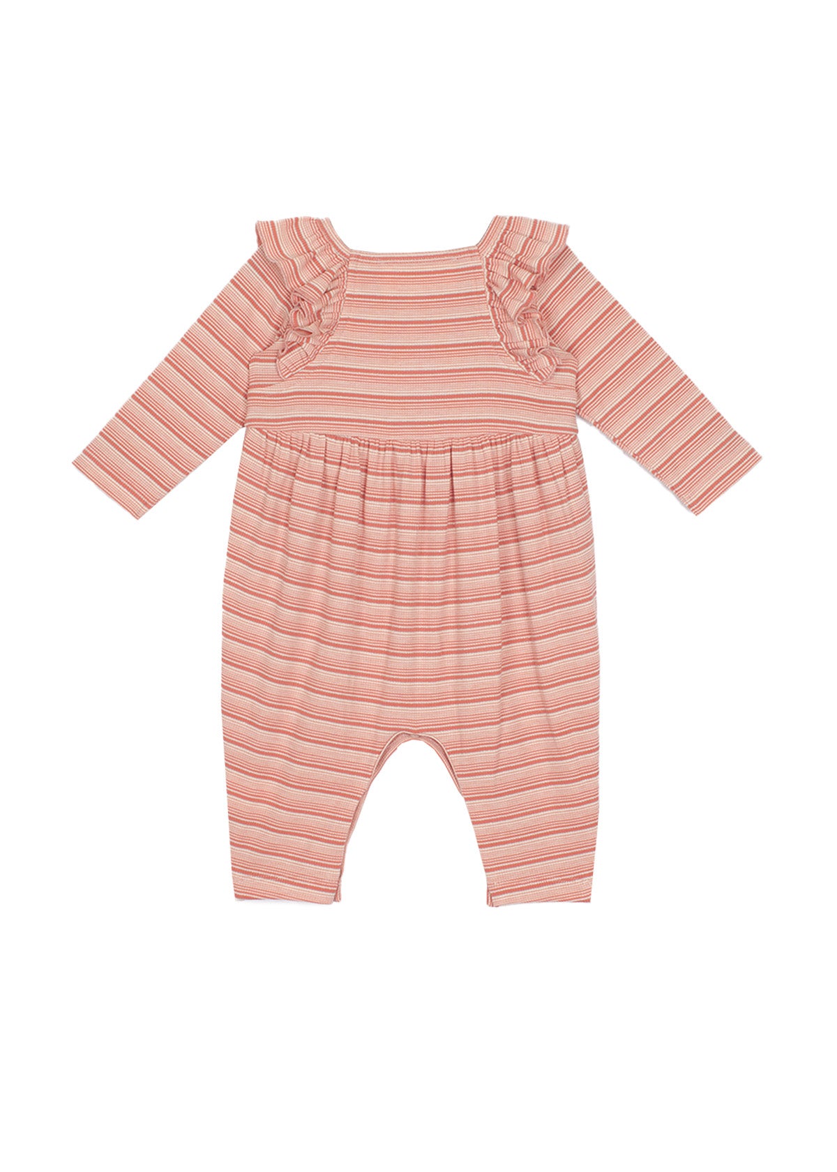 This adorable romper features a delightful red and cream stripe pattern that adds a playful touch to your little one's wardrobe. The long sleeves and ruffled shoulders provide a sweet detail, while the soft, stretchy fabric ensures comfort and ease of movement. Perfect for any occasion, this romper combines style and practicality effortlessly.
