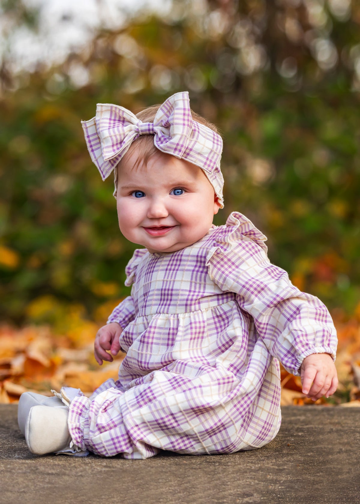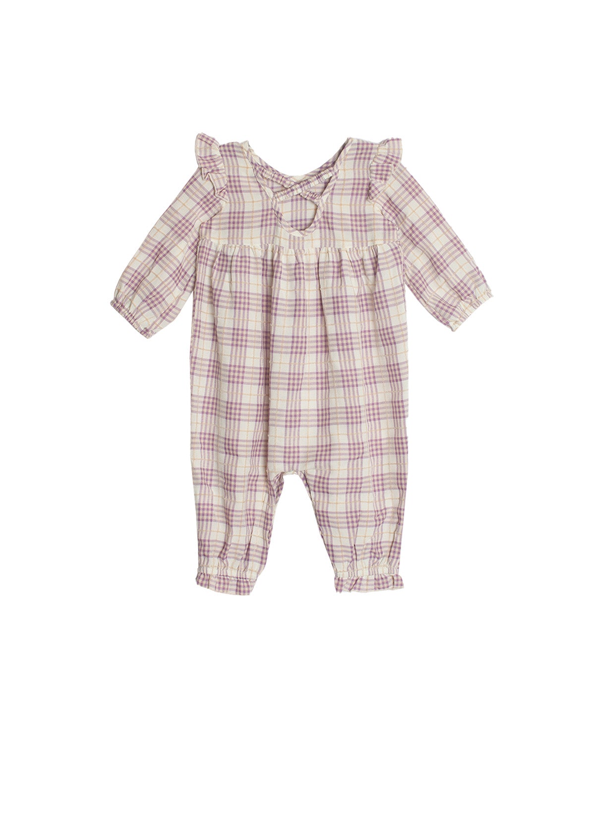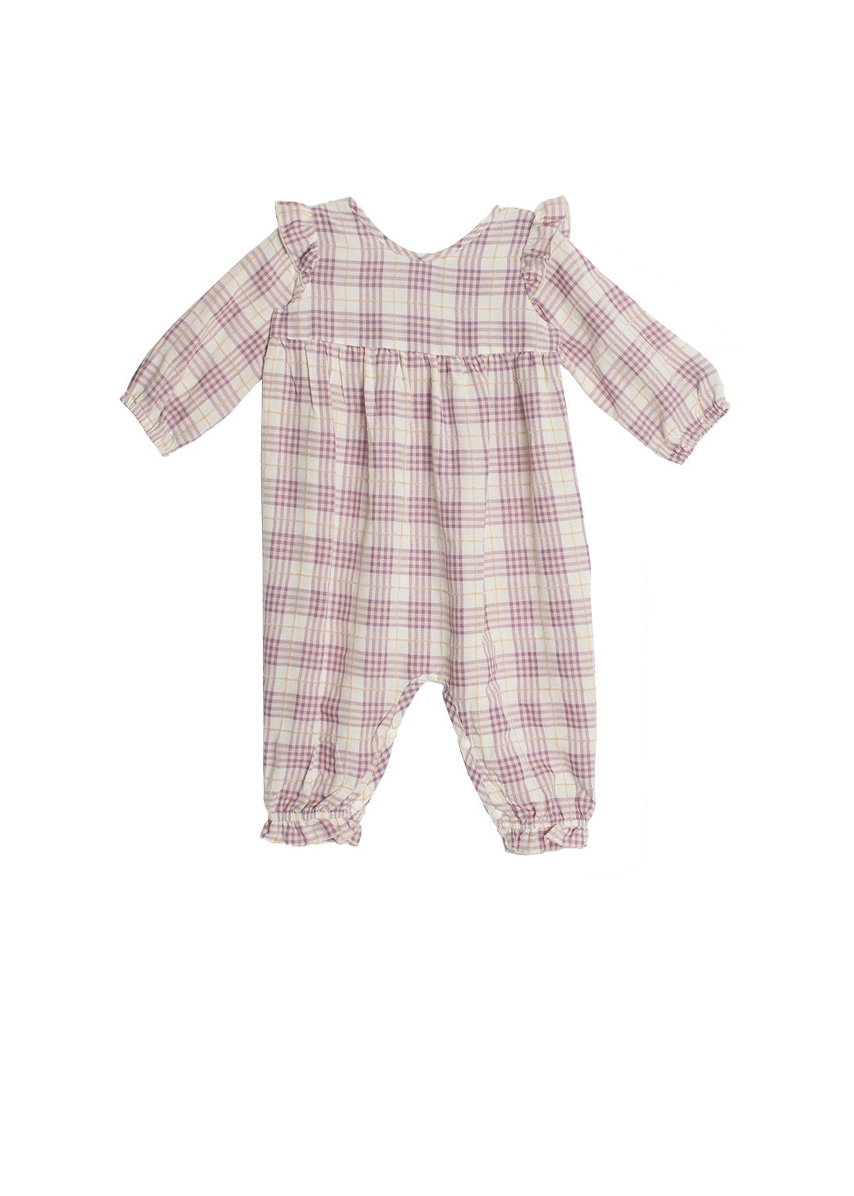 This adorable baby romper features a soft plaid fabric in soothing shades of lavender, cream, and beige. The romper is designed with charming ruffle details on the shoulders and ankle cuffs, adding a touch of sweetness. Long sleeves provide warmth, while the gathered waist ensures a comfortable fit.