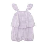 The Mabel and Honey Sugar Plum Sleeveless Romper is a bubble fit romper for baby girls, featuring ruffled straps, an overlay top, and a light lavender gingham pattern with elasticized leg openings for comfort.