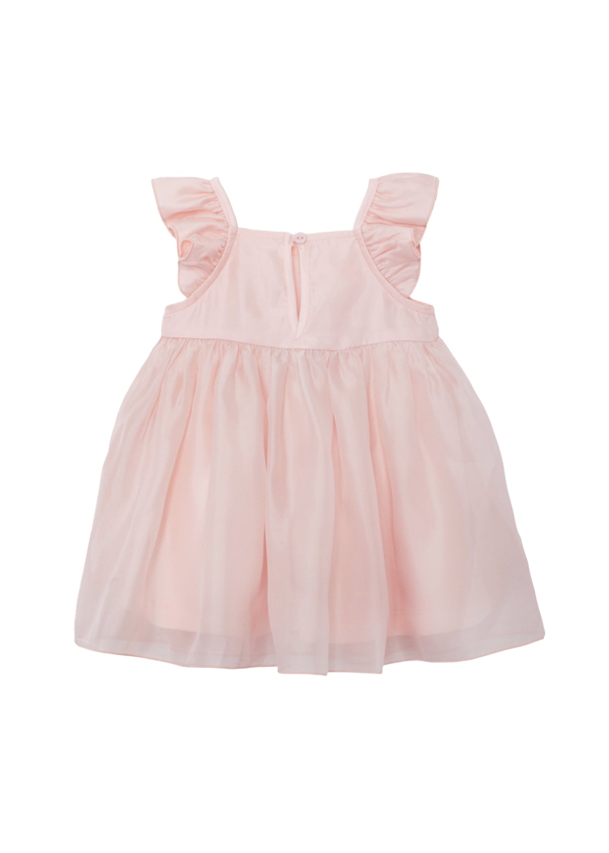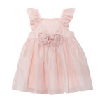 Picture her twirling with joy at her next celebration in this beautiful light pink dress. Designed for special moments, it features sweet flutter sleeve shoulder straps and three beautiful rosettes at the waist. This soft and airy organza dress is perfect to wear all day.
