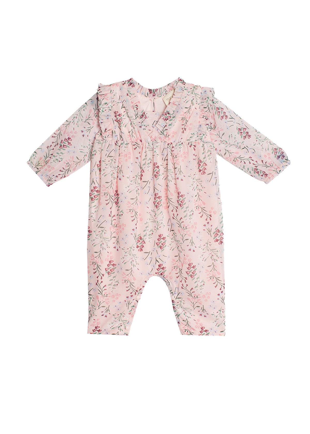This baby romper features a soft pink background with a delicate floral print in shades of green and pink. Designed with long sleeves and gentle ruffle detailing along the shoulders, it offers both comfort and style. Perfect for your little one's everyday adventures.