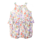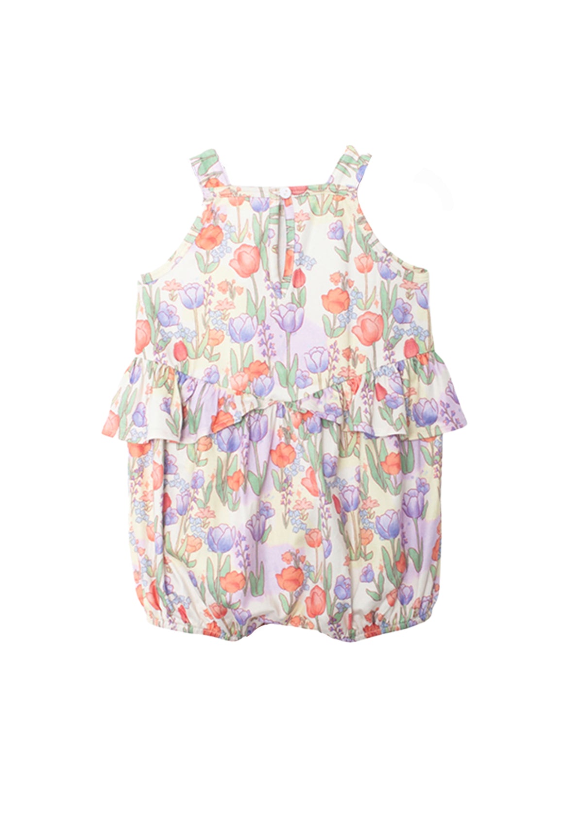 This soft knit baby romper features a tulip waist and elastic leg openings.