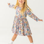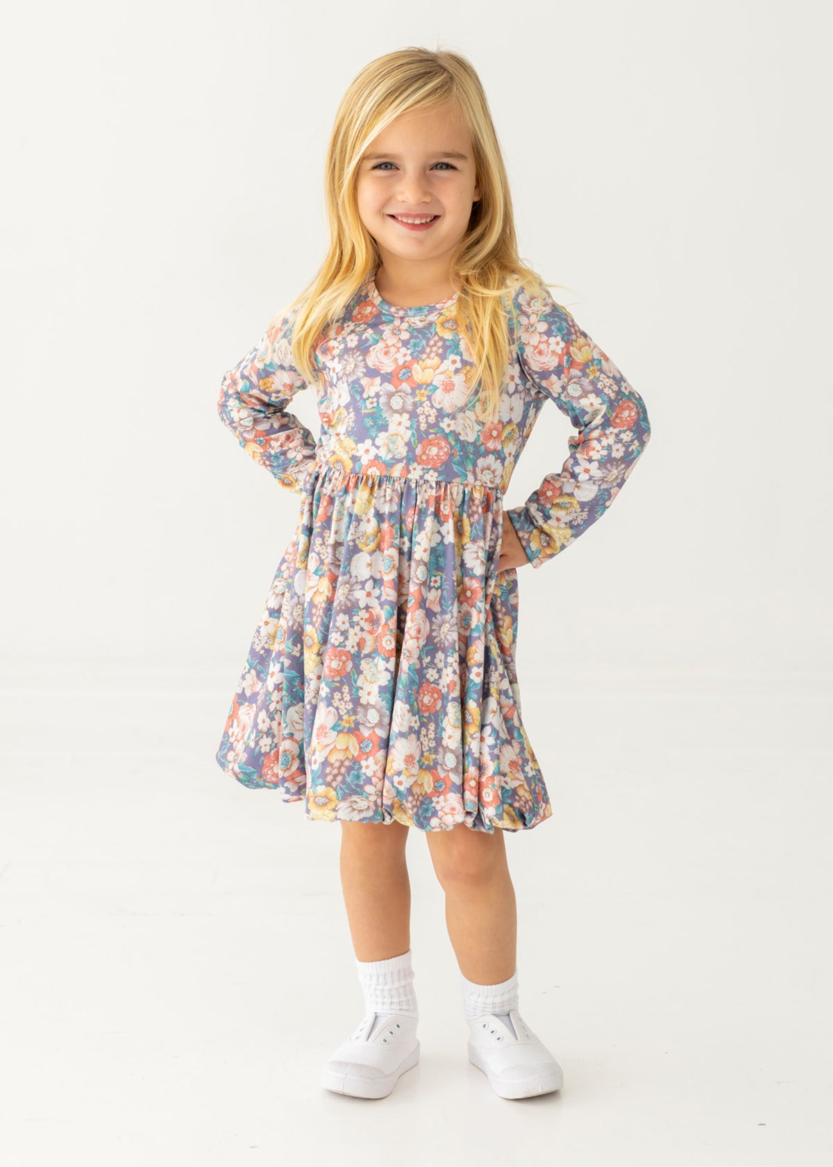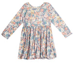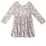This lovely girl's dress features a soft, breathable fabric adorned with a charming floral print in muted tones of blue, pink, and cream. Designed with long sleeves and a gathered waist, this dress offers a perfect blend of comfort and style. Ideal for cooler days, it?s perfect for both casual wear and special occasions