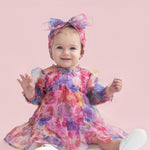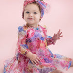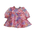 This enchanting girl's dress features a lightweight, sheer fabric with a vibrant floral pattern. The tiered skirt adds volume and movement, while the elasticized cuffs and ruffled neckline offer a delicate touch. Perfect for twirling, this dress is ideal for special occasions and picture-perfect moments.
