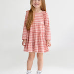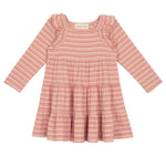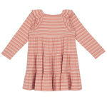 This charming girl's dress features a soft and stretchy fabric with a delicate striped pattern in warm pink tones. The dress is designed with long sleeves and subtle ruffle details on the shoulders, adding a playful touch. The tiered skirt creates a lovely flow, perfect for twirling and everyday adventures. Ideal for both casual and special occasions.