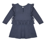 Introducing the Robyn Dress, elegantly tailored in a classic navy hue. This charming piece is crafted from smooth, stretchy cotton blend fabric, ensuring both comfort and durability. It features ruffle accents along the shoulders and a cinched natural waistline with a playful flared skirt, perfect for any stylish outing.