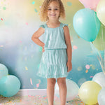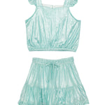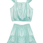 This girls' two-piece set in shimmering aqua metallic fabric features a stylish cropped top with delicate ruffle straps and an elastic hem for a comfortable fit. The matching skirt has a tiered ruffle design and an adjustable drawstring waist, creating a fun and effortlessly trendy look for any occasion.