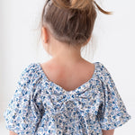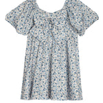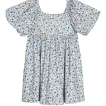This girl's dress showcases a charming blue and cream floral pattern, perfect for a touch of timeless elegance. The square neckline and puffed short sleeves add a playful yet sophisticated detail. With a gathered empire waist and a flowy, knee-length skirt, this dress is ideal for twirling through any occasion.