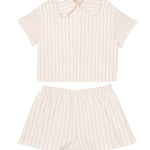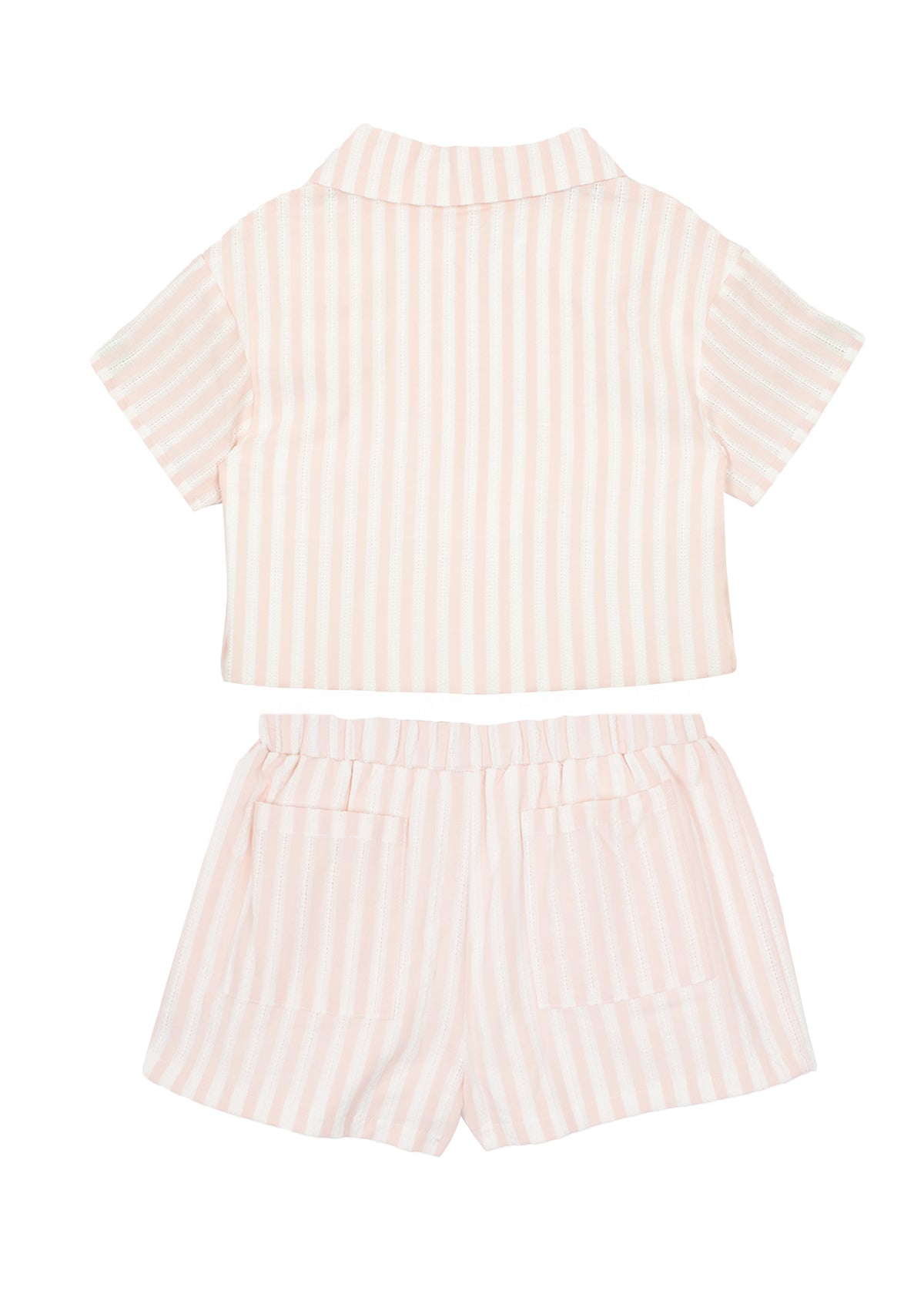 This two-piece set features a soft, woven fabric with a classic pink and white stripe pattern for a timeless look. The short-sleeve button-up top has a relaxed fit and a pointed collar, while the matching elastic-waist shorts provide all-day comfort. A stylish and breezy outfit for warm-weather days.