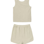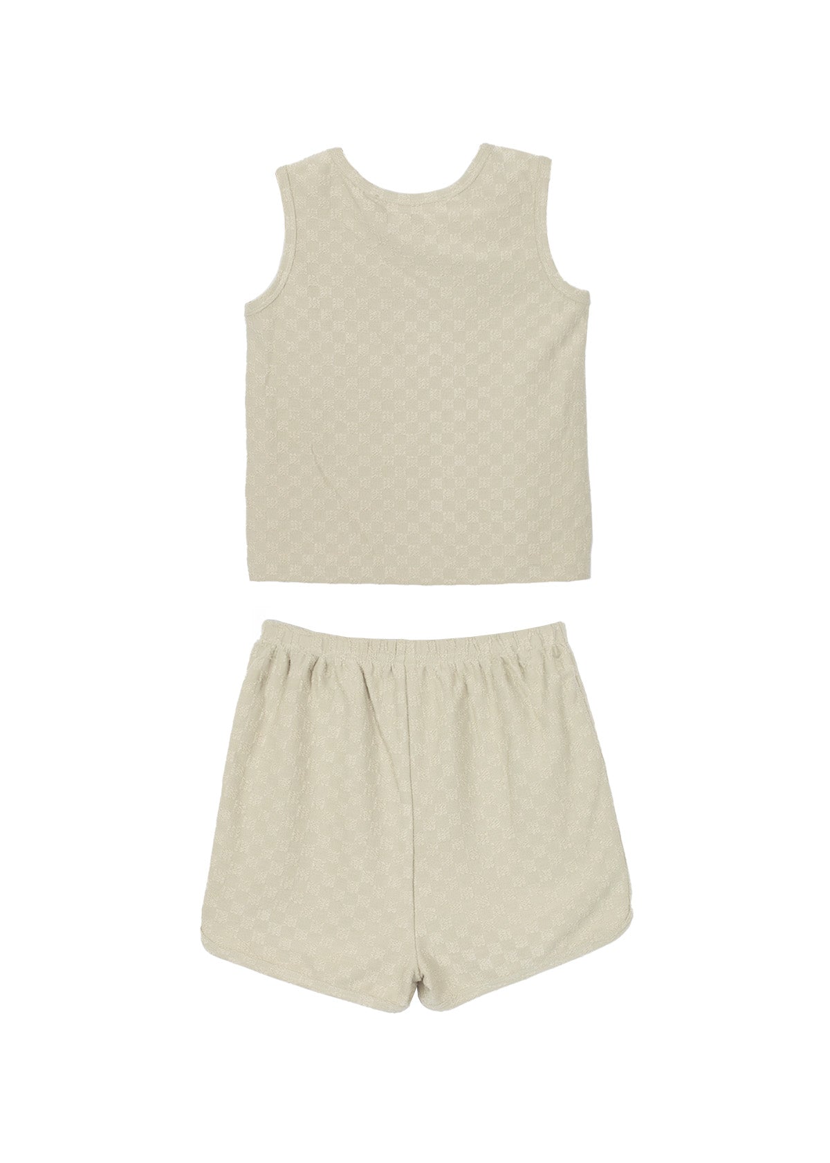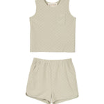 This boys' two-piece set in a muted sage tone features a sleeveless top with a subtle textured pattern and a small chest pocket for added detail. The coordinating shorts offer a relaxed fit with an elastic waistband and side pockets, making this breathable and lightweight outfit perfect for everyday wear.