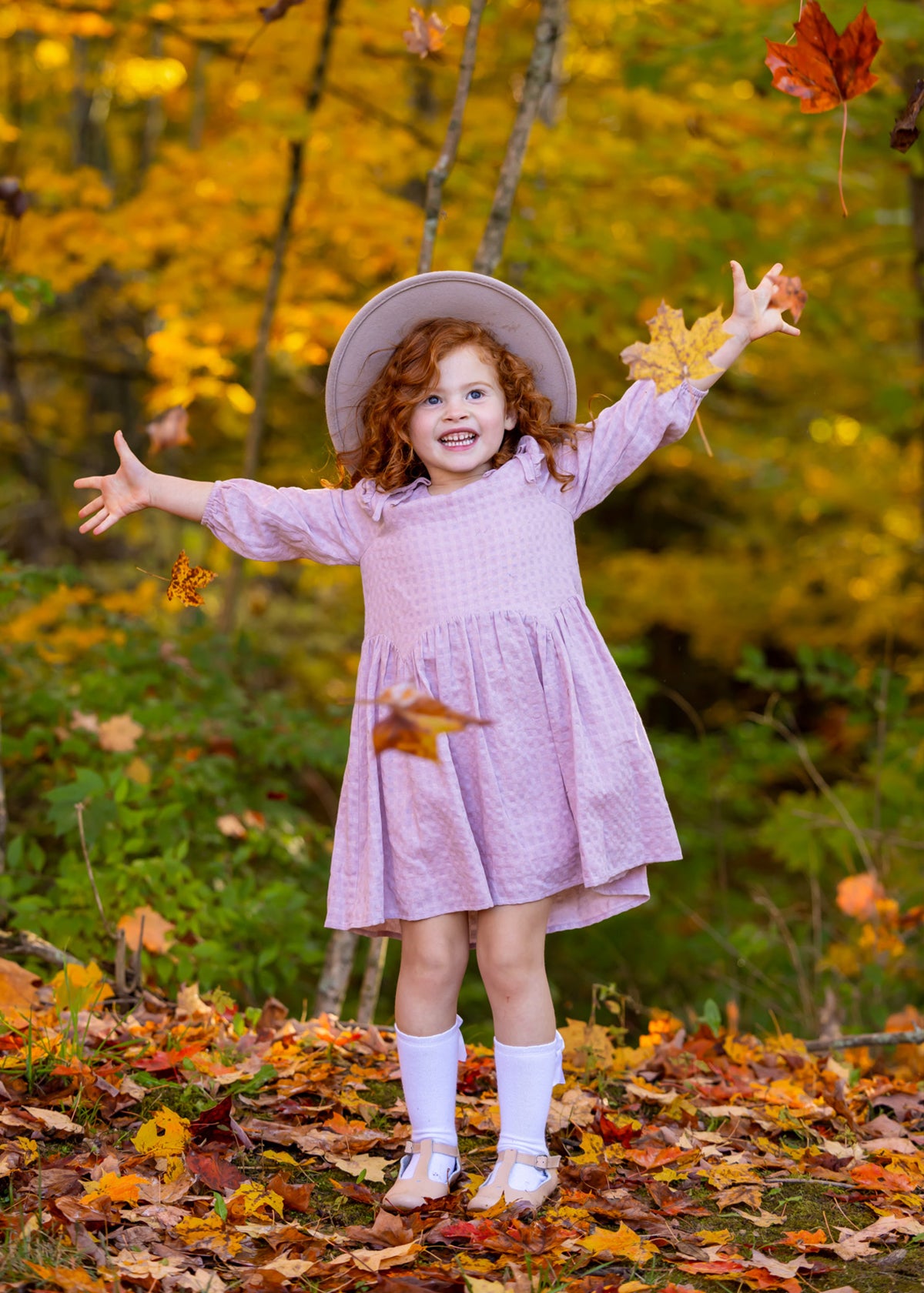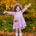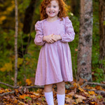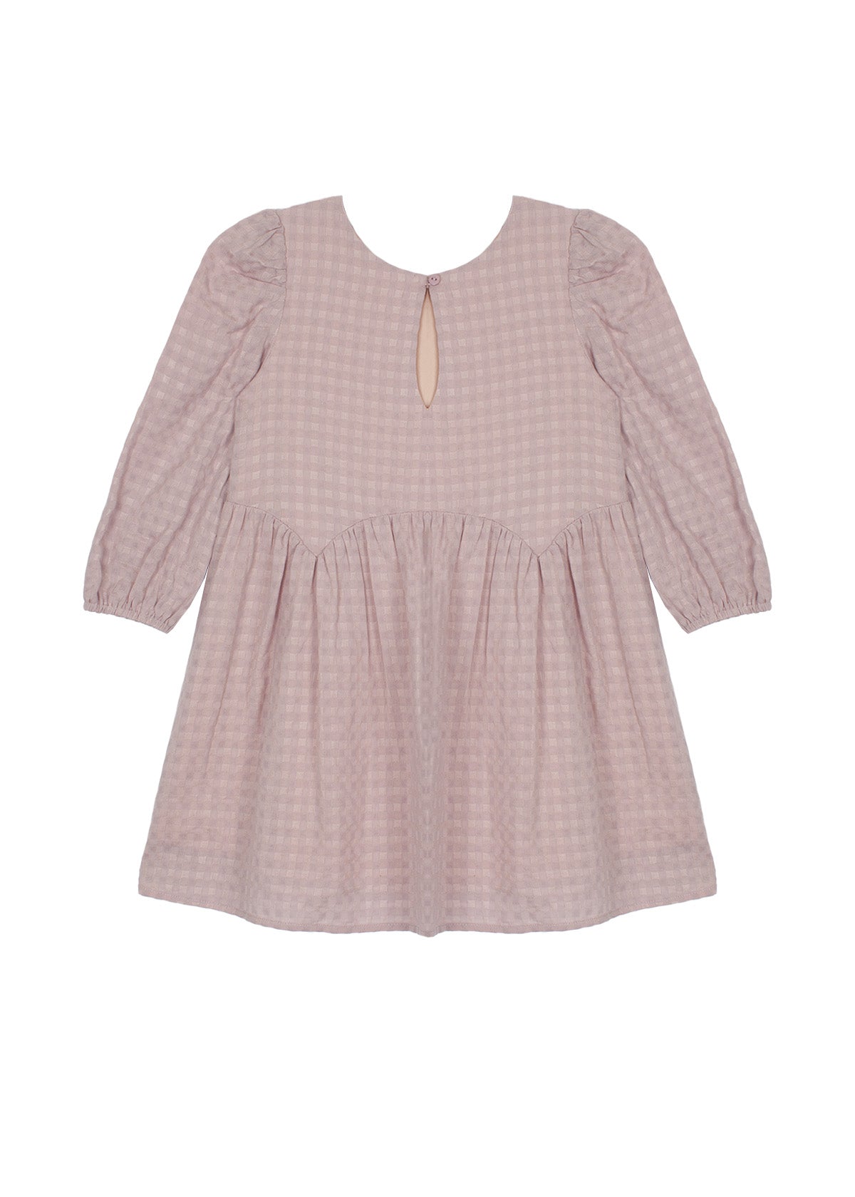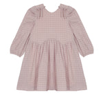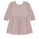 The "Check Me Out" girl's dress is crafted from a soft, breathable fabric in a delicate mauve gingham pattern. This dress features long sleeves with elasticized cuffs and charming bow details at the shoulders, adding a touch of elegance. The gathered waist enhances the silhouette, making it an ideal choice for both casual and special occasions.