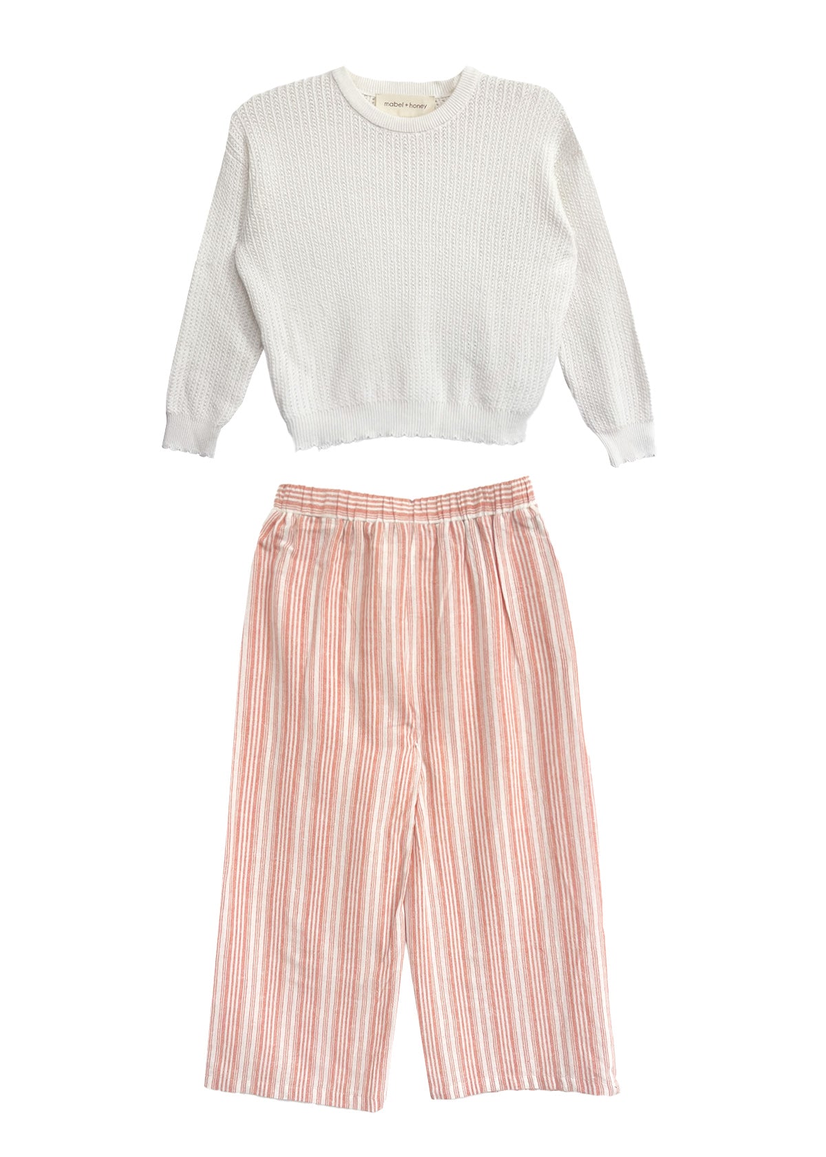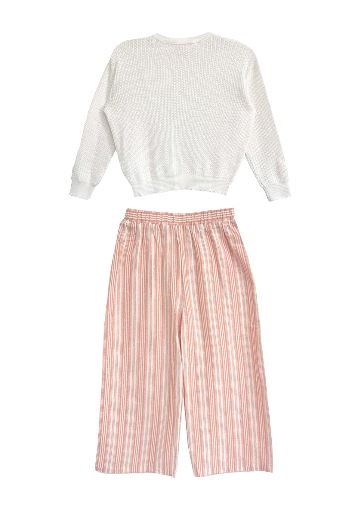 Wrap your little one in comfort and style with the Claire two piece set. Featuring a cozy white knit sweater with ribbed cuffs and hem, paired with lightweight pink-and-white striped pants designed with an elastic waistband for easy wear. Its versatile design is perfect for playdates or relaxed afternoons, delivering a delightful blend of charm and practicality?your go-to choice for effortless outfits!