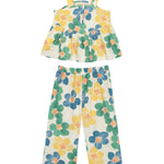 This vibrant 2-piece set for girls features a bold floral print in shades of yellow, green, and blue. The set includes a sleeveless top with bow details on strap and a peplum styled top, paired with matching wide-leg pants with an elastic waistband for a comfortable fit. Perfect for sunny days and playful outings.