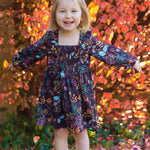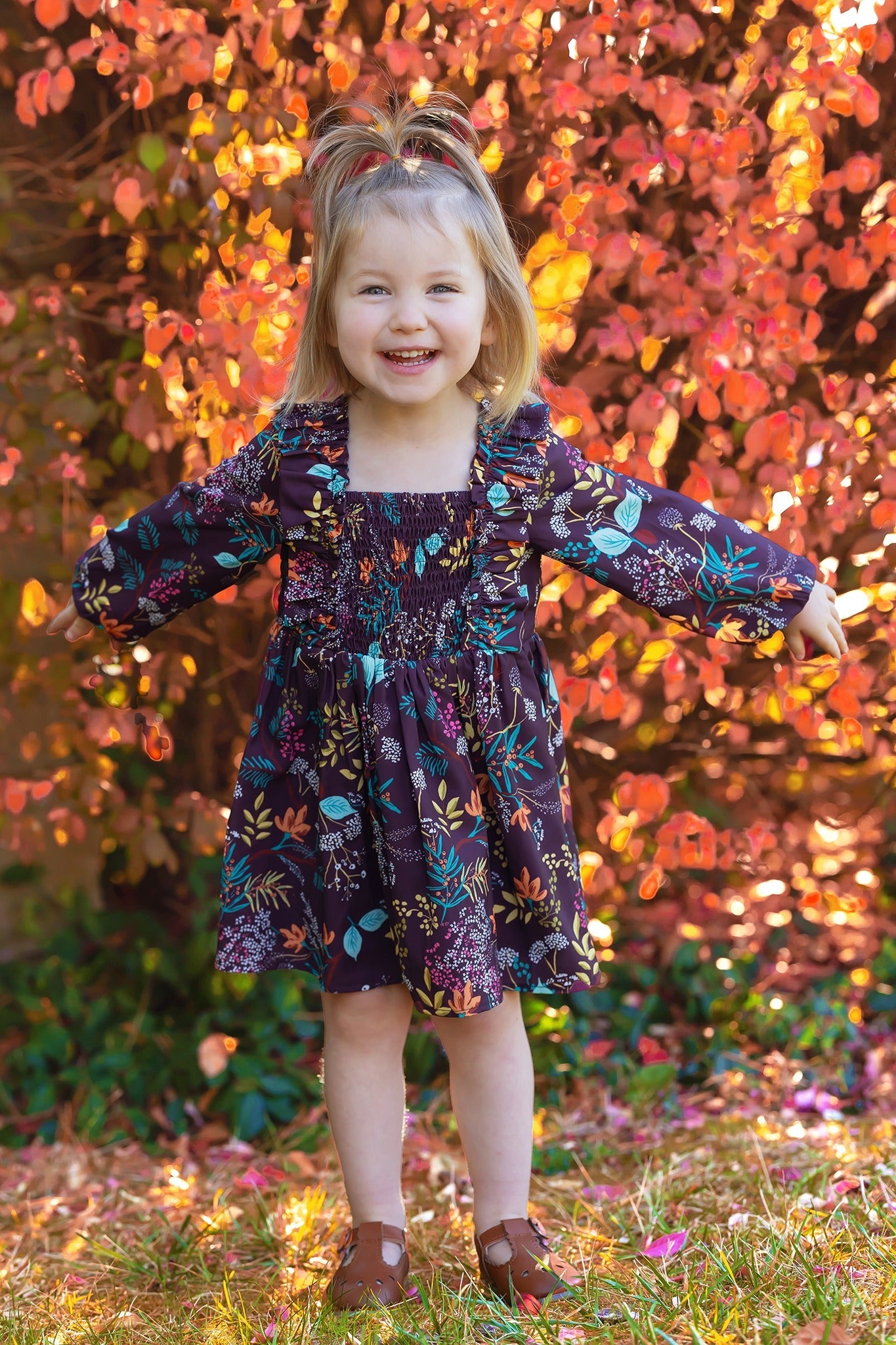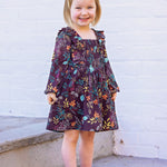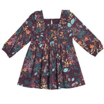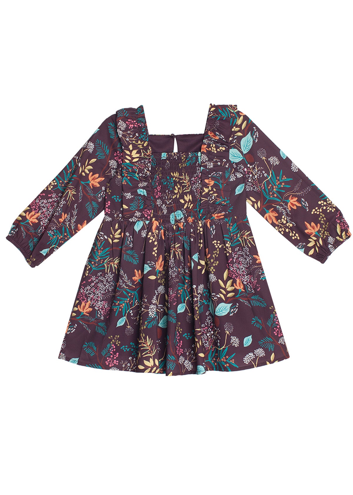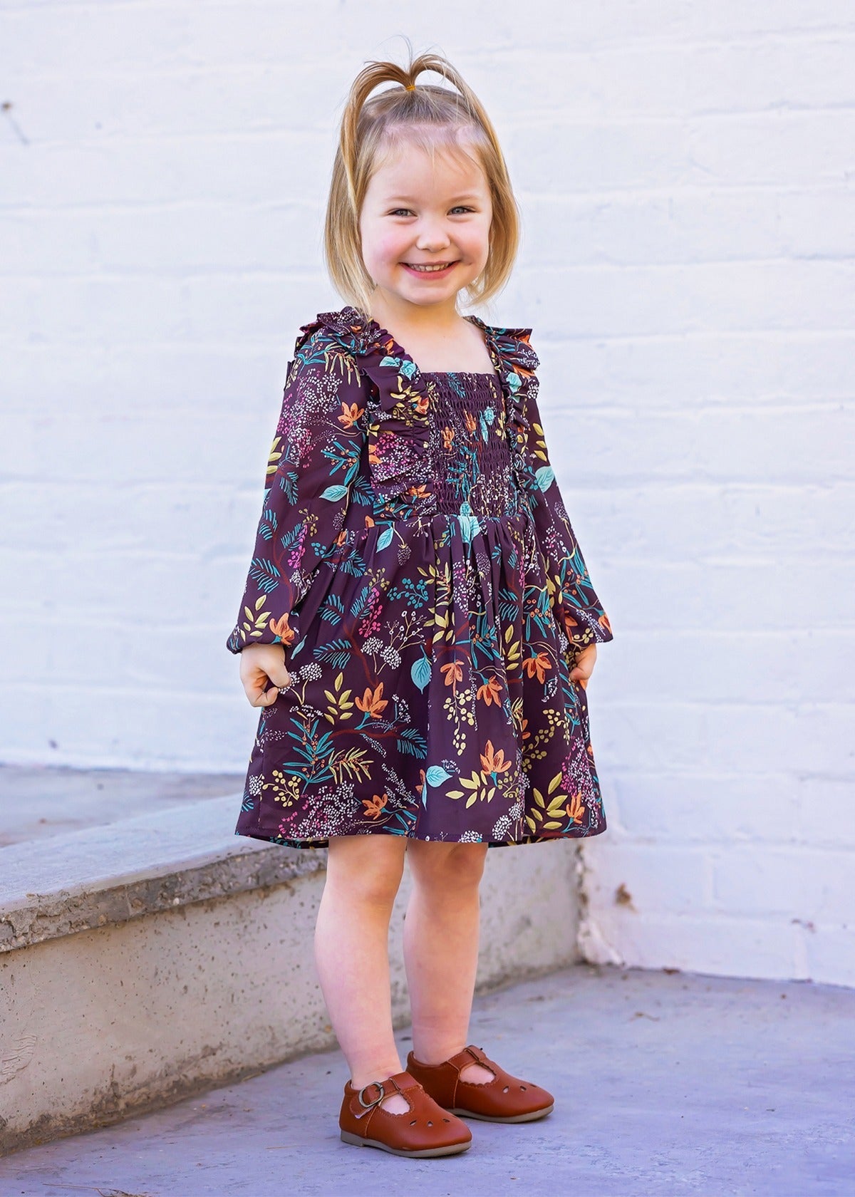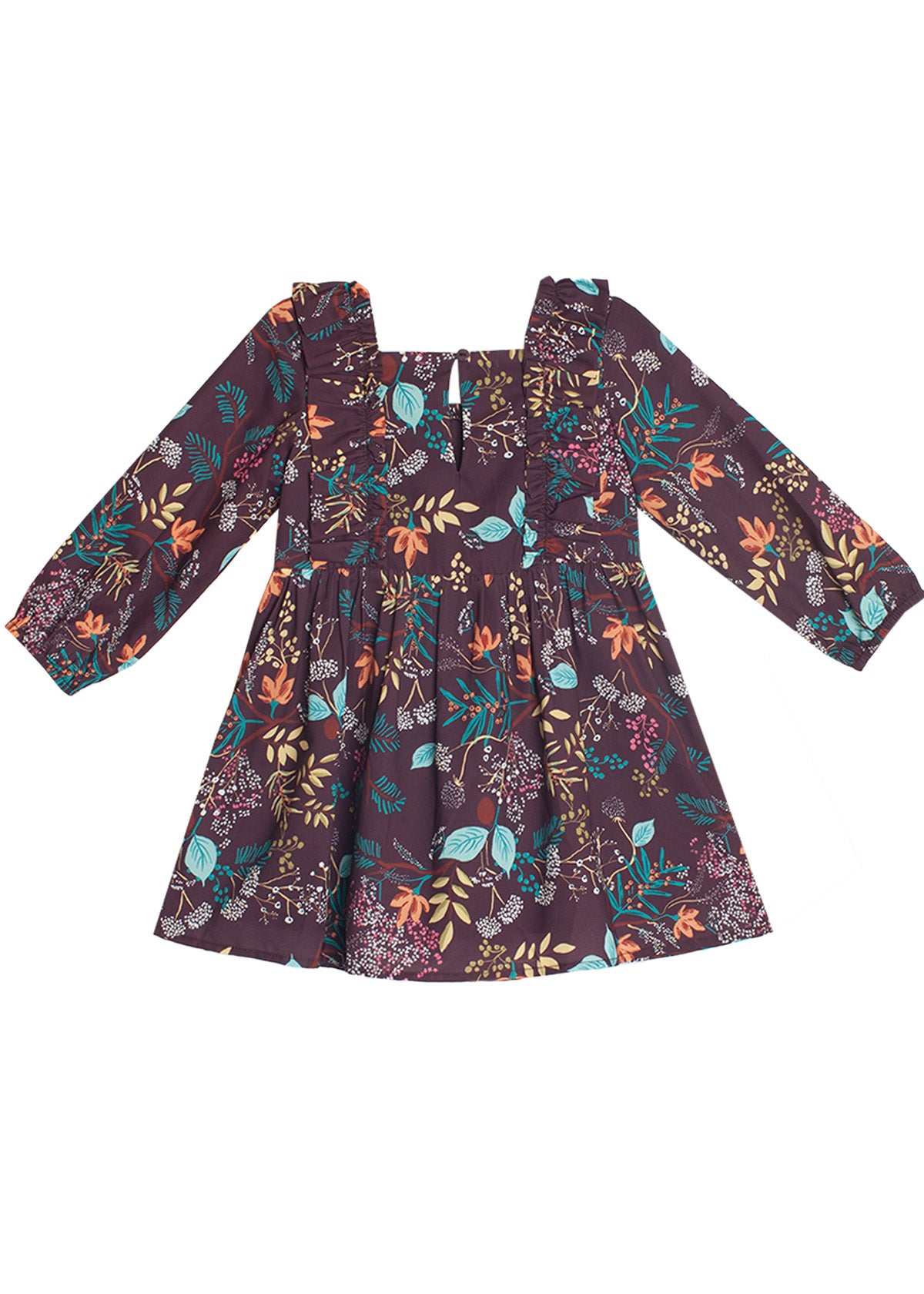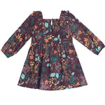 This enchanting girls' dress features a deep brown background adorned with a vibrant floral pattern in shades of teal, orange, and yellow. The fabric is soft and flowy, offering comfort and style. Detailed with a square neckline, ruffled trim, and long puffed sleeves, this dress is perfect for any special occasion or fall outing.