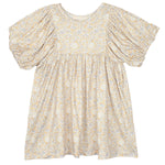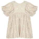 This girl's dress showcases a charming floral print in soft yellow and blue tones, creating a vintage-inspired aesthetic. The dress features voluminous puff sleeves that add a whimsical touch to the silhouette. The gathered waistline provides a comfortable fit, while the flowing skirt offers a playful and elegant movement, perfect for any occasion.