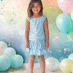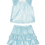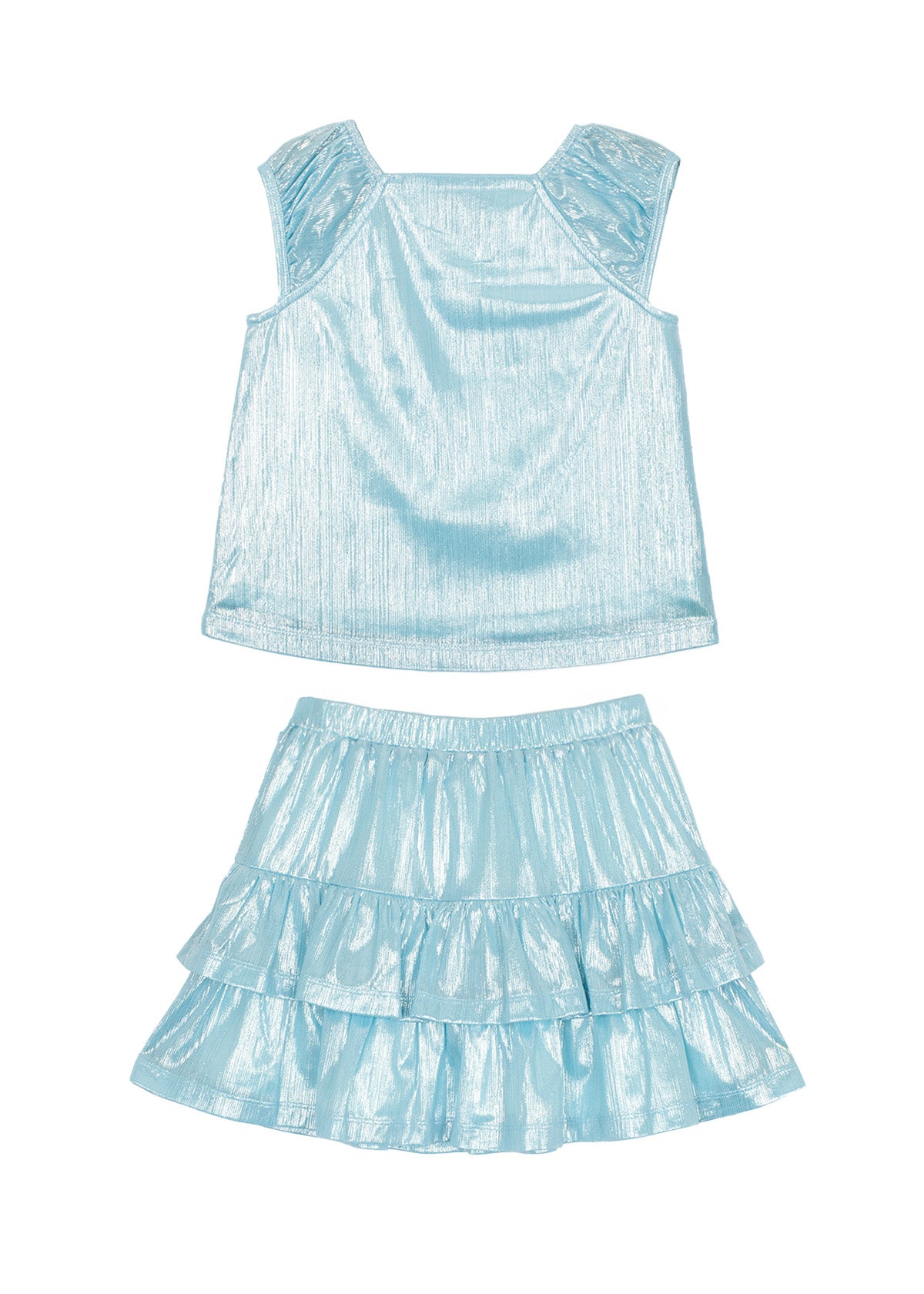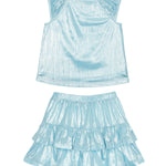 This girls' two-piece set in shimmering sky blue metallic fabric features a sleeveless top with delicate ruffle-trimmed shoulders for a stylish touch. The matching tiered ruffle skirt adds movement and flair, creating a fun and trendy look. Lightweight and comfortable, this set is perfect for making a bold fashion statement.