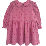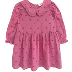 The Perfect in Pink Dress is a delightful addition to any little girl?s wardrobe. Its soft pink tone is beautifully complemented by a playful pattern of darker pink hearts, creating a cheerful look. Featuring a whimsical ruffled collar and matching ruffled cuffs on long sleeves, this dress combines elegance with fun. The gathered waist flows into a full, lightweight skirt, providing comfort and freedom for movement. Whether it?s a birthday party or a family outing, this dress brings style and grace to every occasion.