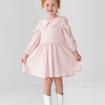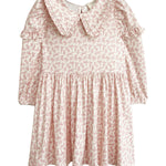 The Primrose Dress is all about understated elegance, perfect for your little one. Crafted in a soft pink fabric with a delicate floral print, it combines timeless charm with thoughtful details. The ruffled collar and sleeves add a playful yet sophisticated touch, while the gathered skirt creates a flowing silhouette. Ideal for creating memorable moments, this dress is as comfortable as it is beautiful.
