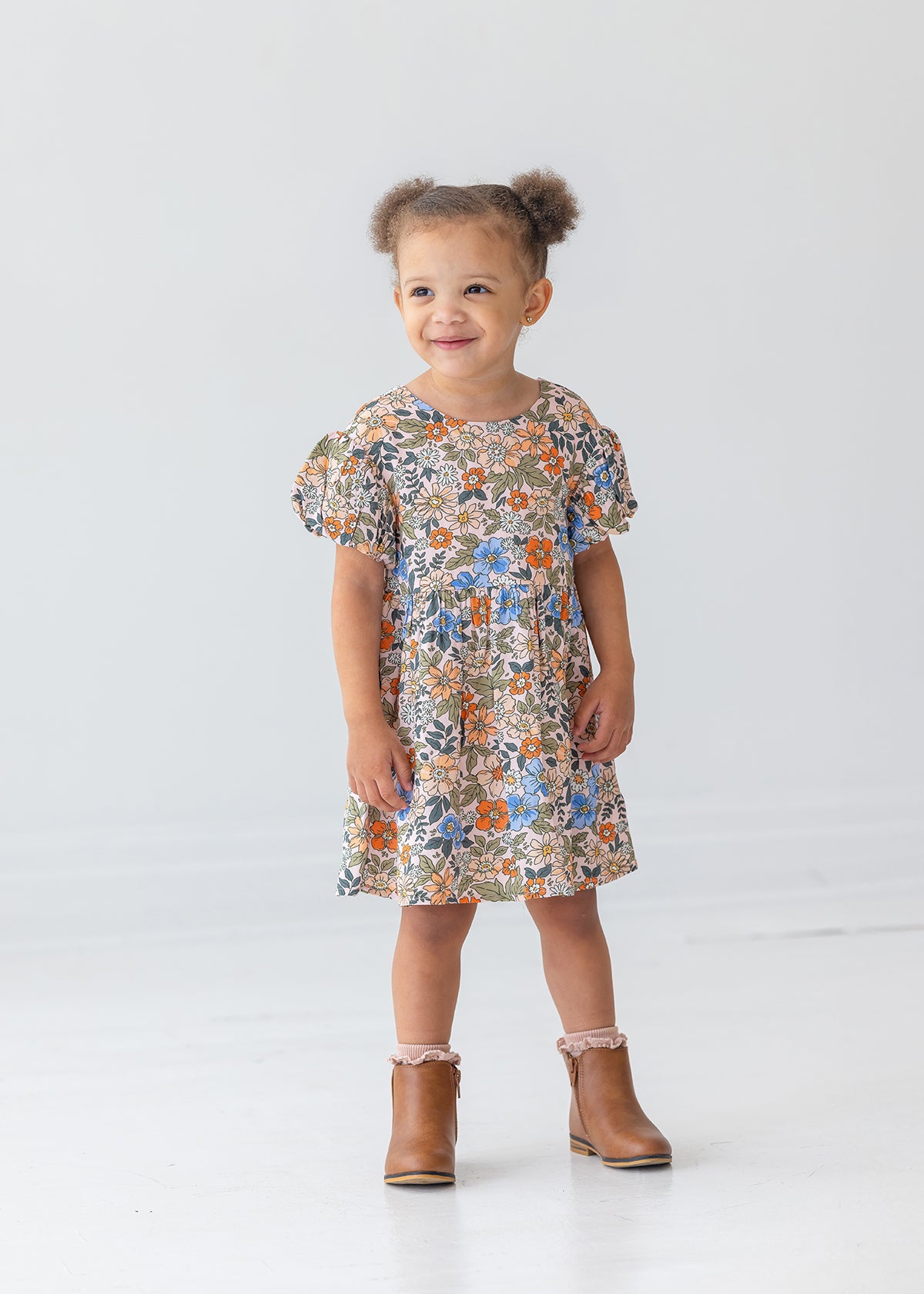 The Riley Dress is a delightful blend of style and comfort, perfect for adding a splash of color to your little one?s wardrobe. Featuring a round neckline and short sleeves, it?s adorned with a vibrant floral pattern. The breathable fabric and relaxed fit ensure all-day wearability.