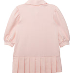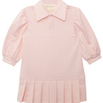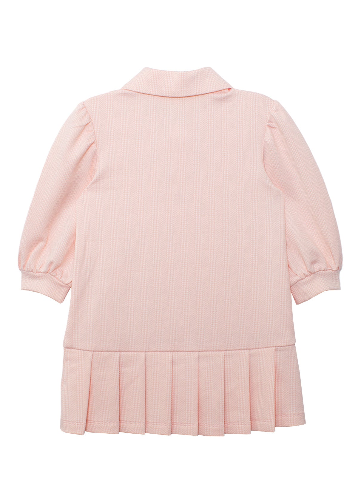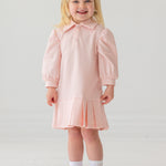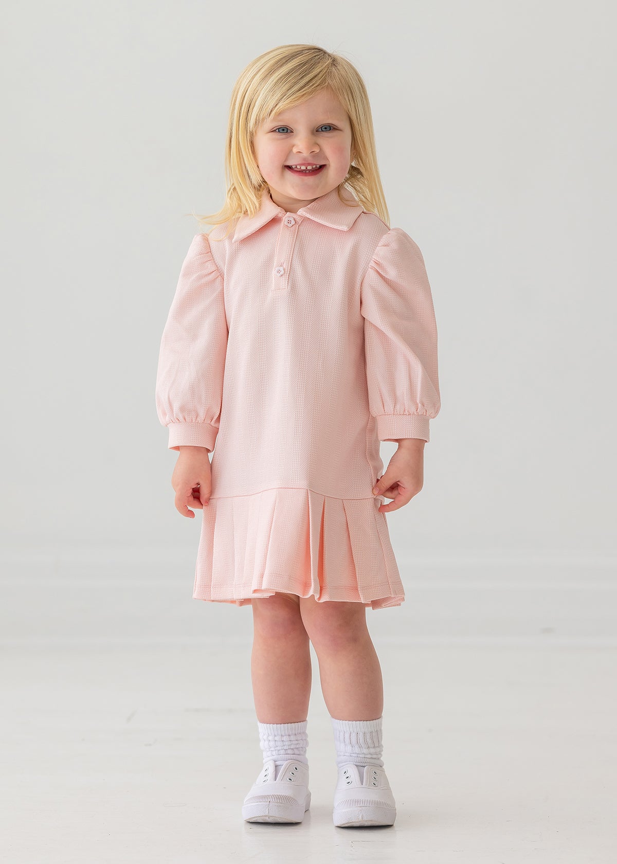 The Serena dress brings effortless style to your little one?s wardrobe. Featuring a soft pink hue with a subtle textured pattern, this dress boasts long sleeves, a classic collared neckline with button details, and a pleated skirt for added volume. Perfect for both playdates and special occasions, it offers elegance and comfort in one delightful design.