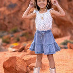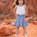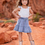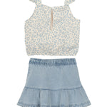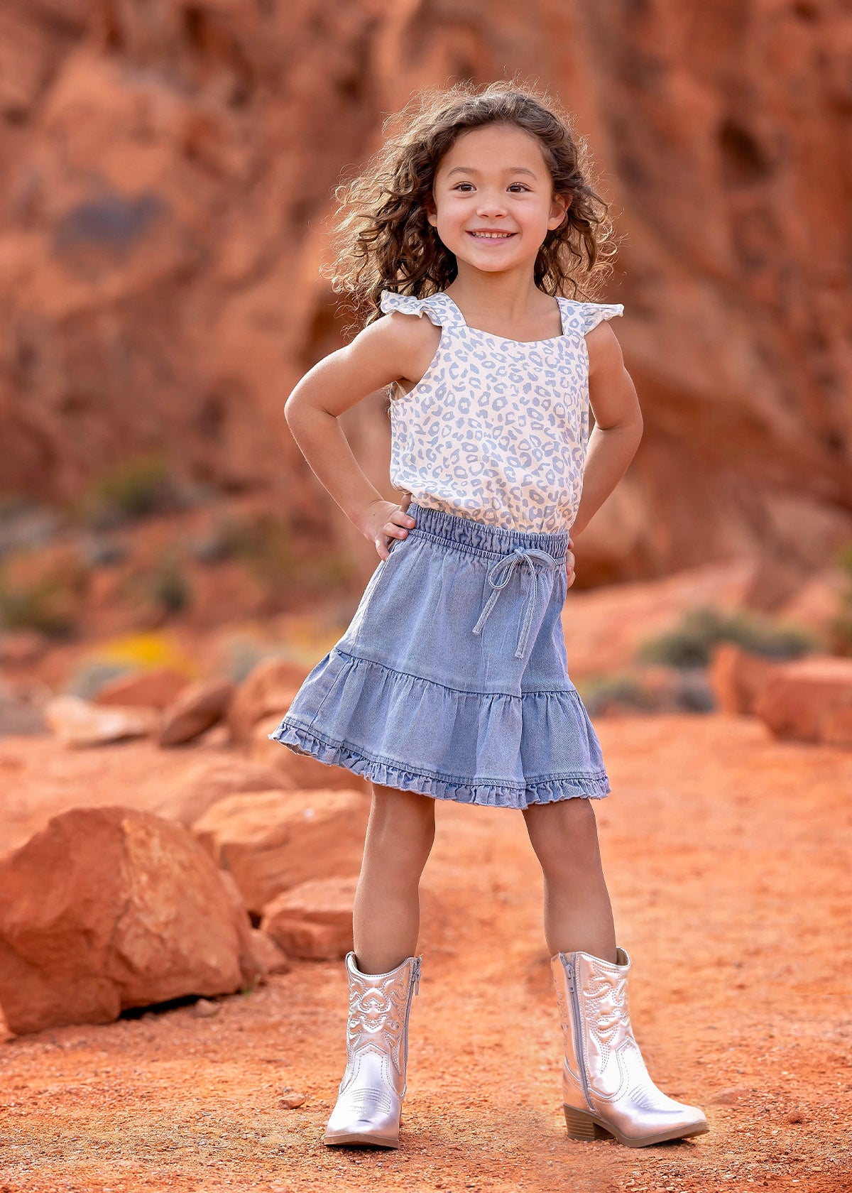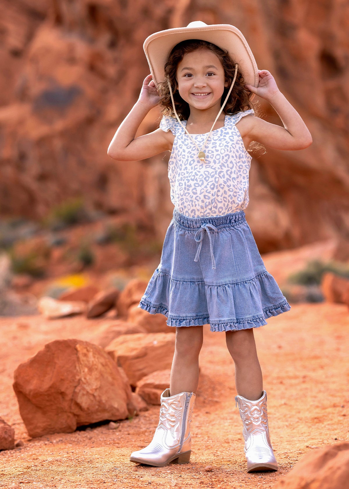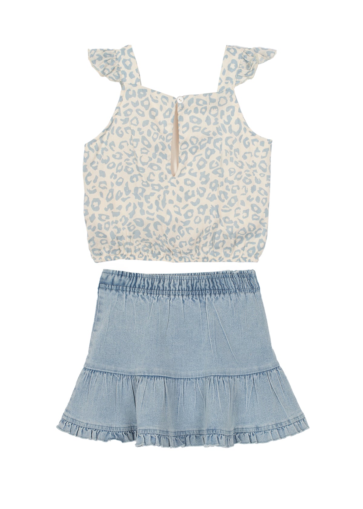 This girls' 2PC set features a flutter-sleeve top with a soft ivory base and delicate blue leopard print for a stylish touch. Paired with a tiered denim skirt featuring an elastic waistband and drawstring details, this set blends comfort and fashion, making it perfect for casual outings and everyday wear.