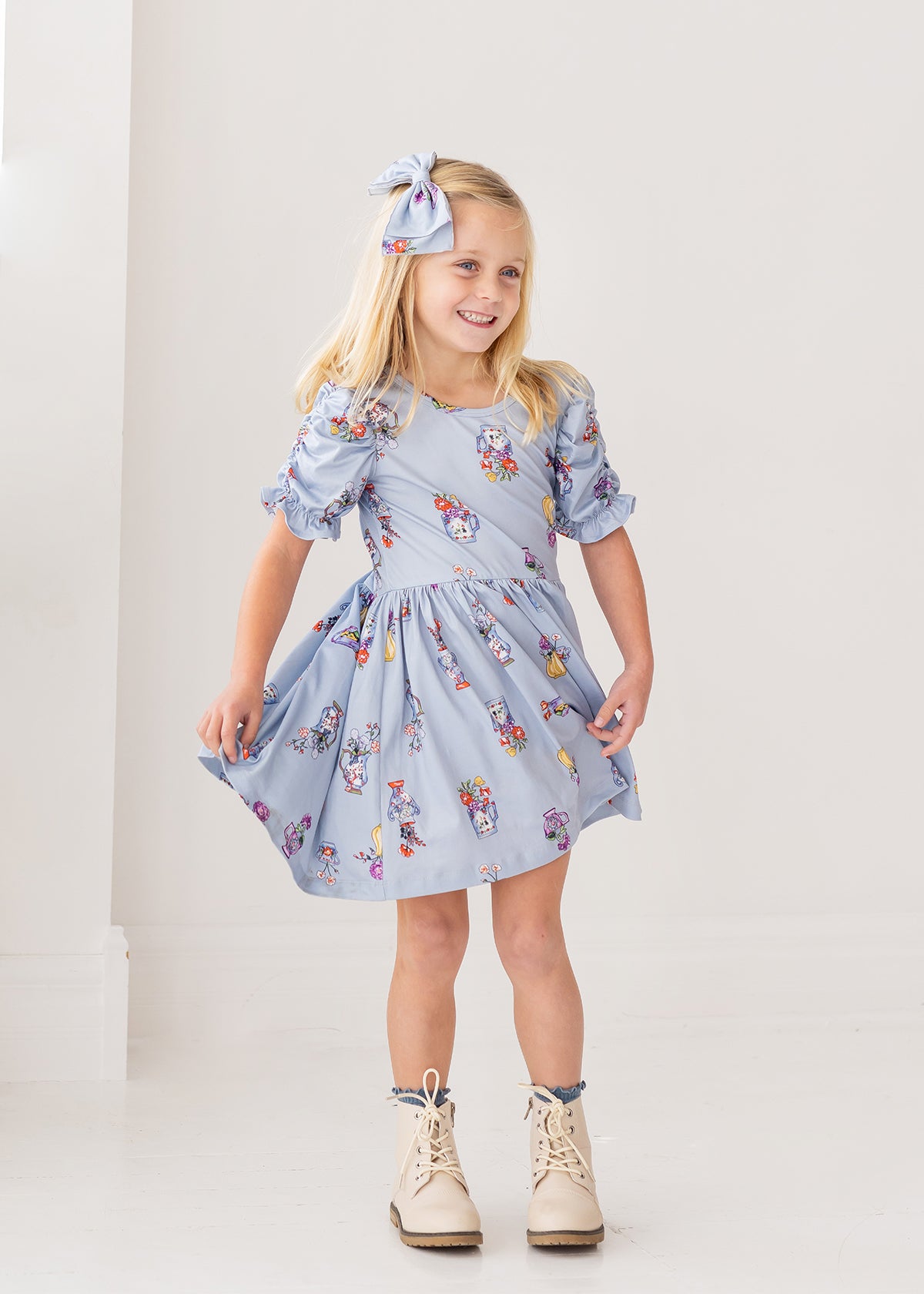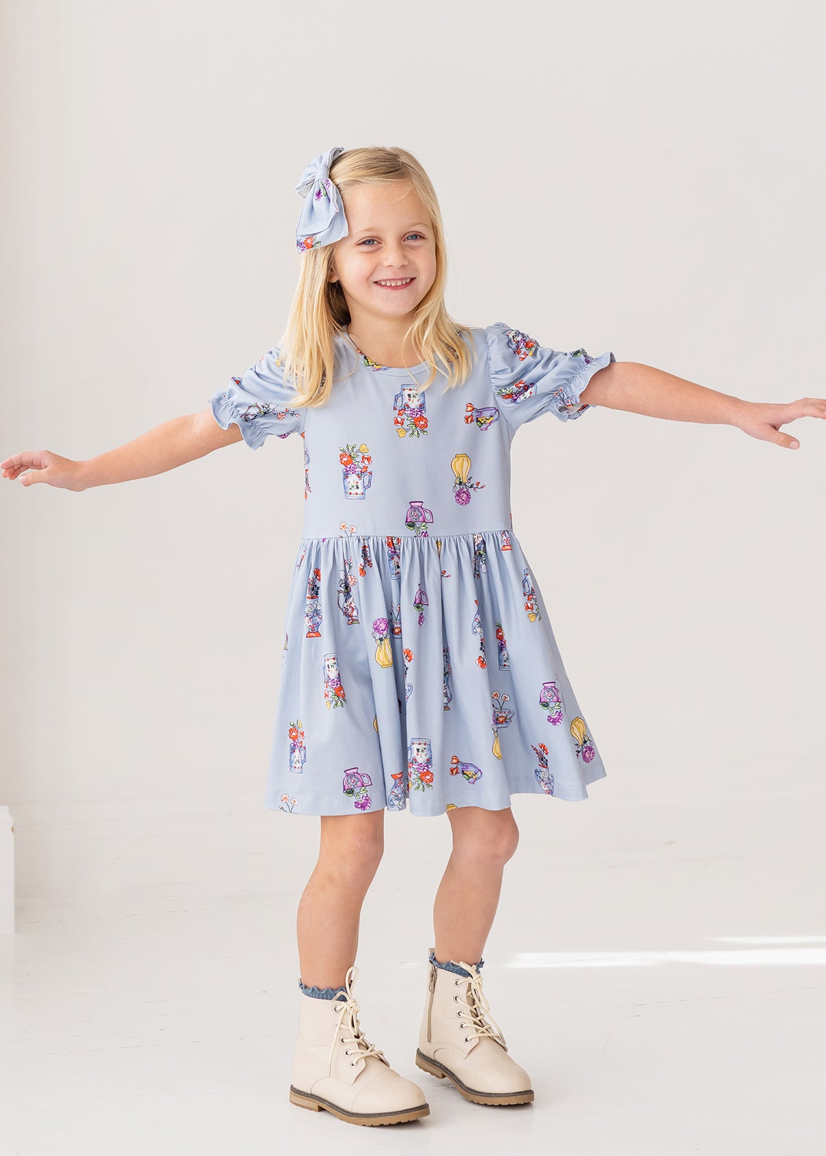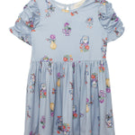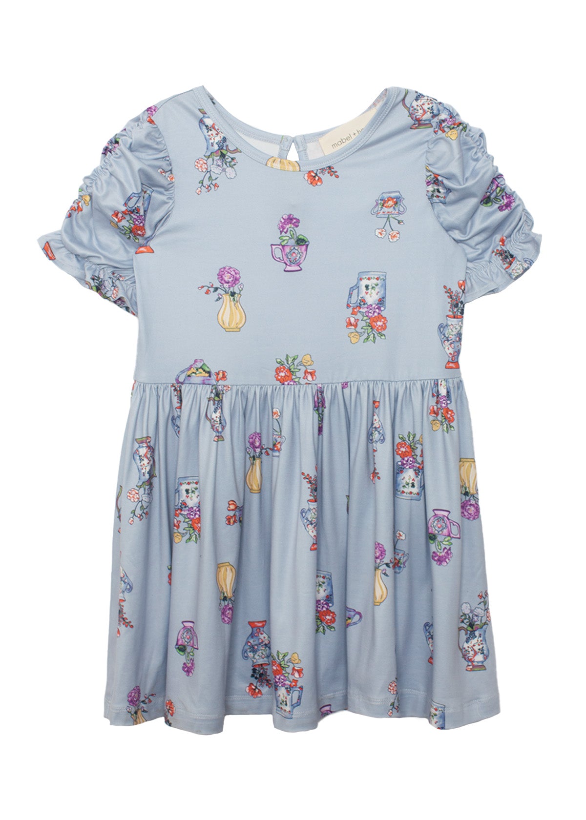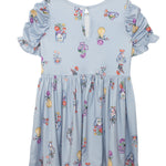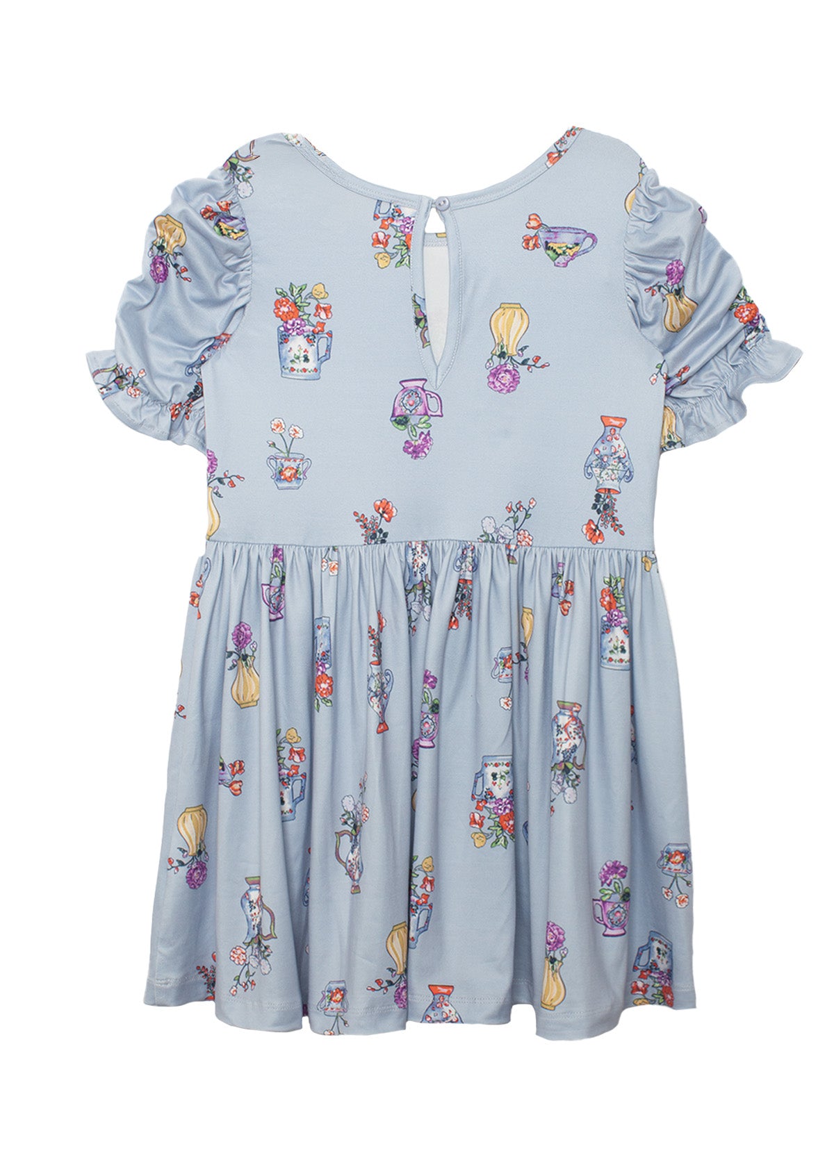 The Tea Party dress is the perfect blend of playful design and everyday elegance. Its beautiful light blue backdrop is adorned with whimsical vase and teacup motifs filled with vibrant flowers in shades of red, purple, pink, and yellow. Featuring puffed, ruched sleeves and a gathered skirt, this dress offers a comfortable yet effortlessly stylish fit, perfect for adding a touch of magic to any day.