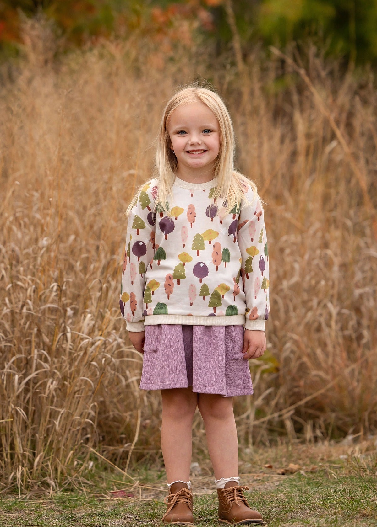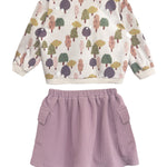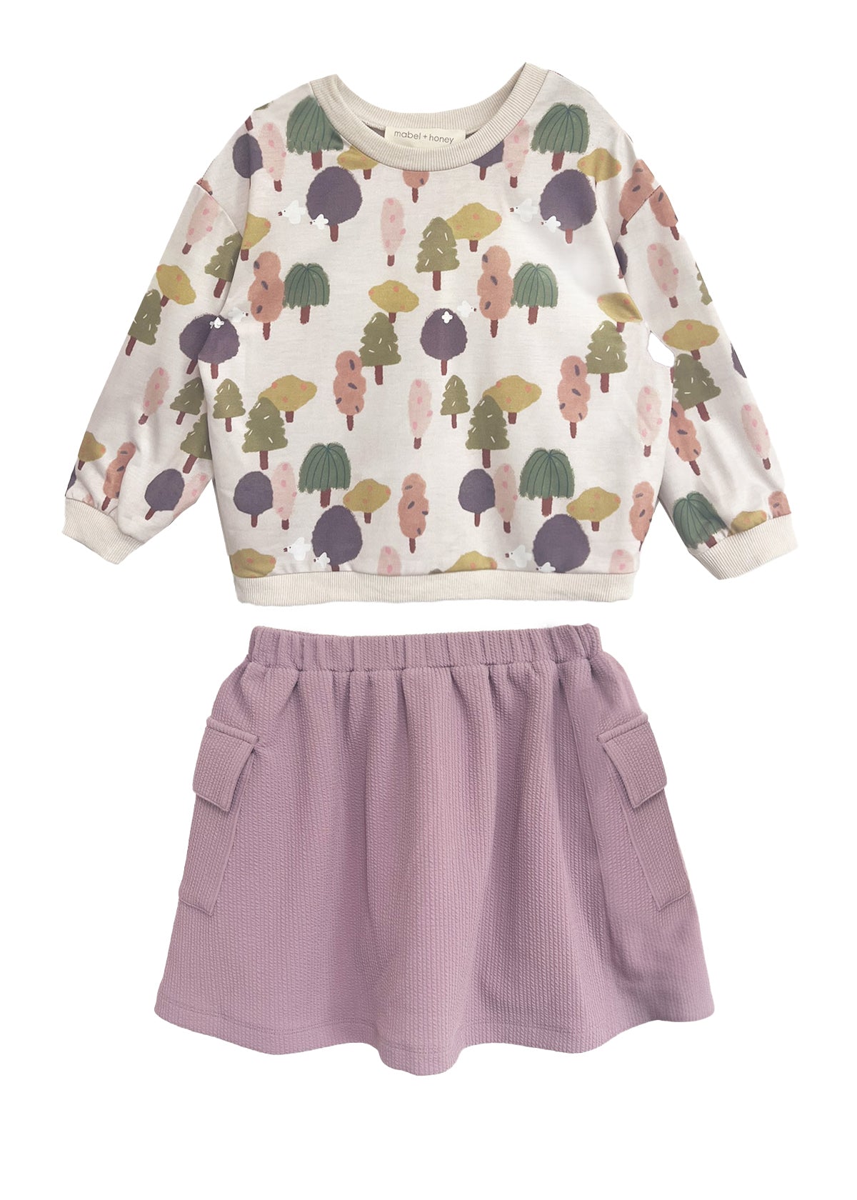The Treehouse two piece set by Mabel and Honey is the perfect blend of playful charm and everyday comfort. The long-sleeved top features a whimsical tree pattern in soft pastel hues of green, pink, purple, and yellow on a cream-colored background, complete with ribbed cuffs and hem for a snug fit. Pair it effortlessly with the light purple A-line skirt, made from textured fabric and designed with functional side flap pockets. Together, this coordinated set creates a delightful and versatile outfit for your little adventurer!