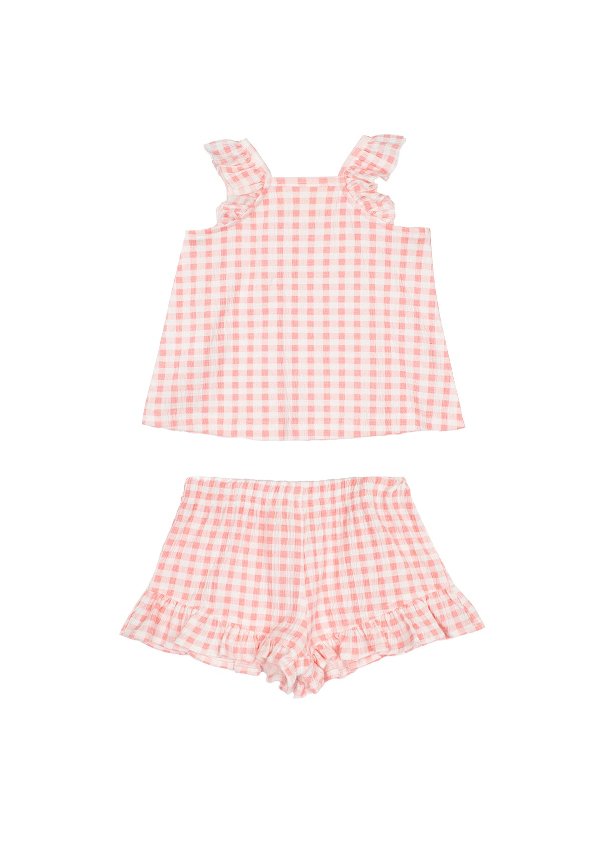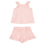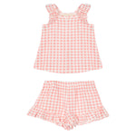 This adorable 2PC set for girls features a sleeveless top and matching shorts, both adorned with a classic pink and white gingham pattern. The top is designed with ruffled shoulder details, while the shorts have an elasticized waist and ruffled hem for added charm. Perfect for warm weather, this set combines style and comfort effortlessly.