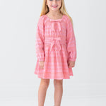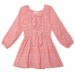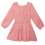 The Watermelon Lemonade dress is a delightful shade of pink accented with orange stitching for a vibrant touch. Featuring a smocked bodice, long sleeves, and a softly flared skirt, this dress offers style and comfort in equal measure. Two ruffled bows at the neckline and waist add a playful touch, making it perfect for any occasion.