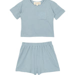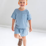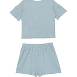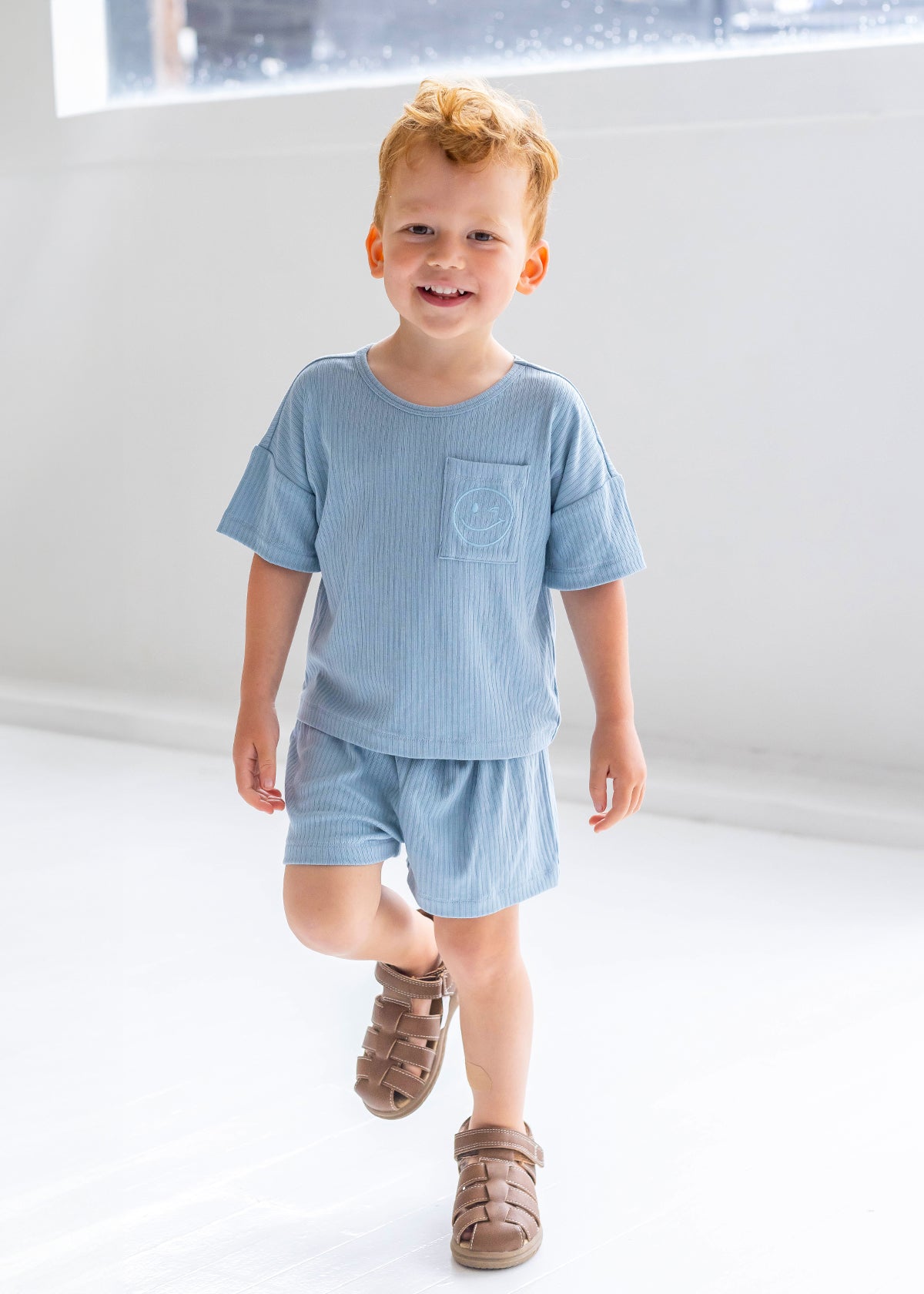 This boys' 2PC set in a soft dusty blue hue features a ribbed texture for a cozy yet stylish feel. The short-sleeve top includes a chest pocket with an embroidered smiley face for a playful touch. Paired with matching elastic-waist shorts, this lightweight set is perfect for everyday comfort and movement.