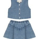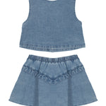 This girls' 2-piece set in classic blue denim features a sleeveless button-up vest with a V-neckline for a trendy, layered look. Paired with a flared skirt that has a ruffled V-detail and an elastic waistband for a comfortable fit, this stylish set blends fashion and function for everyday wear.