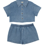 This girls' 2-piece set in classic blue denim features a button-up top with a structured collar and short sleeves for a stylish, modern look. Paired with matching elastic-waist shorts for all-day comfort, this versatile set blends effortless style with everyday ease, perfect for creating a trendy and relaxed outfit.