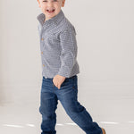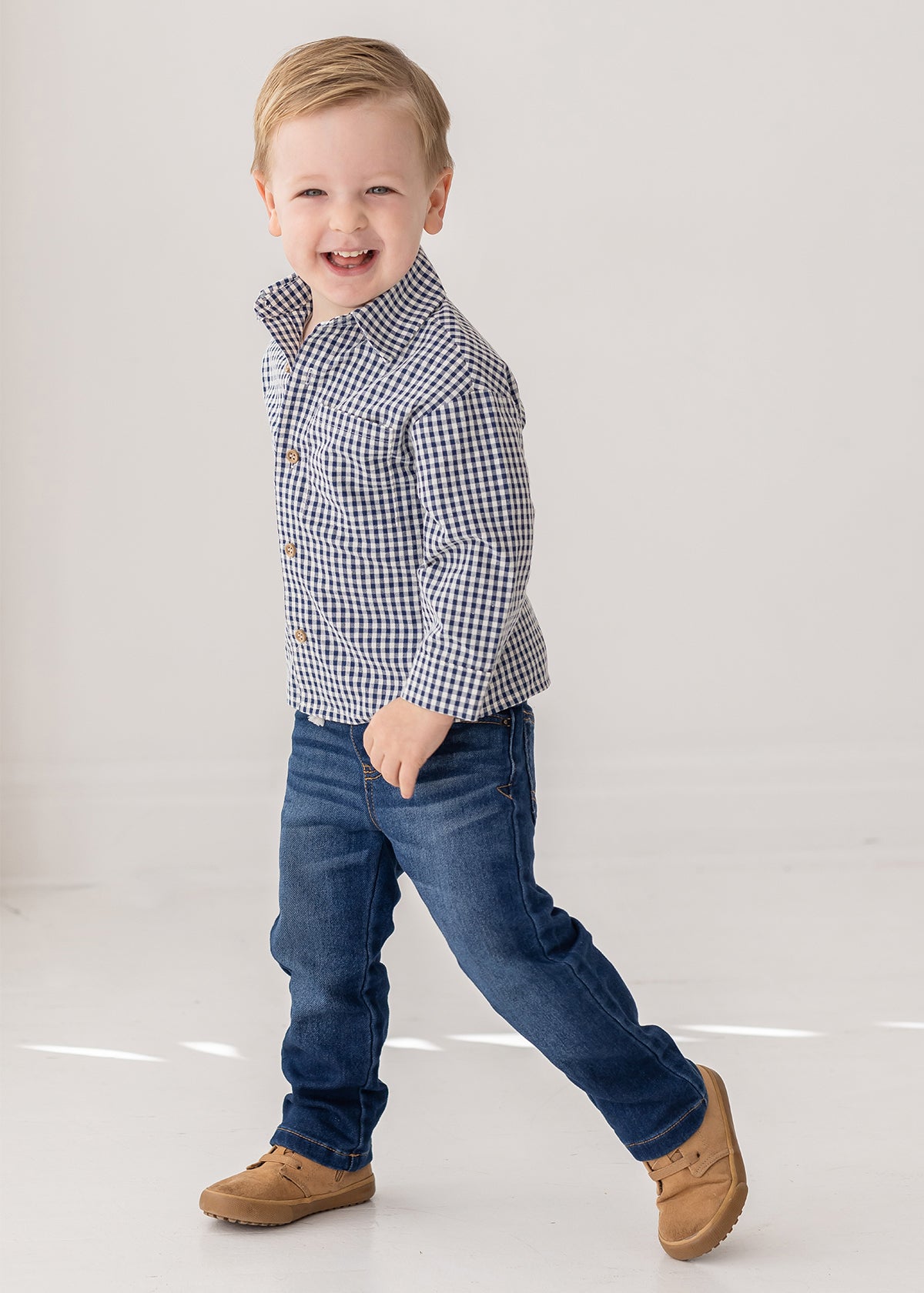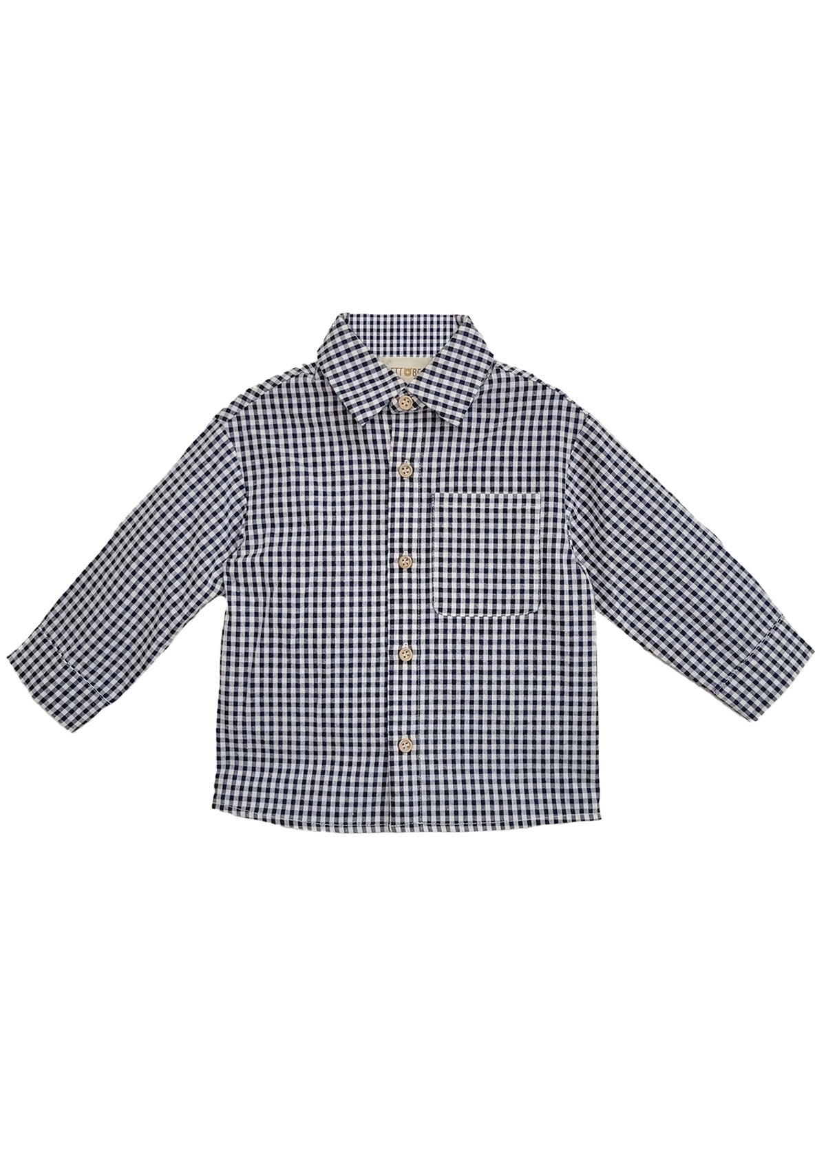 Introduce a touch of playful sophistication to your little one?s wardrobe with the Liam Shirt. Featuring a black and white checkered pattern, complemented by light brown buttons, this long-sleeve shirt is made from premium materials for durability and comfort. Perfectly designed with a single chest pocket and a crisp collar, the Liam Shirt blends classic design with everyday versatility.