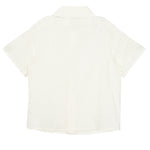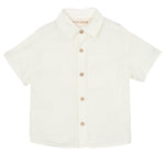 This ivory boys' short-sleeve button-up shirt is a timeless wardrobe essential. Crafted from a lightweight, breathable fabric, it features a classic pointed collar, a functional front pocket, and wooden button closures for a refined touch. Perfect for both casual and dressy occasions, it offers all-day comfort with effortless style.