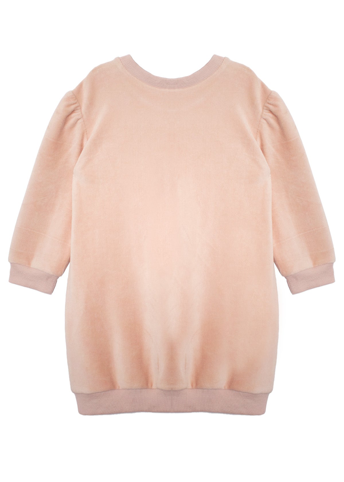 The Peach Keen dress brings soft sophistication to your little one's wardrobe. Its plush light pink fabric features long sleeves with a slight puff at the shoulders for a sweet silhouette. Two scalloped front pockets add a playful touch, while ribbed details on the neckline and cuffs provide a snug, cozy fit. Perfect for casual playdates or semi-formal outings!