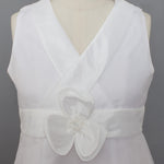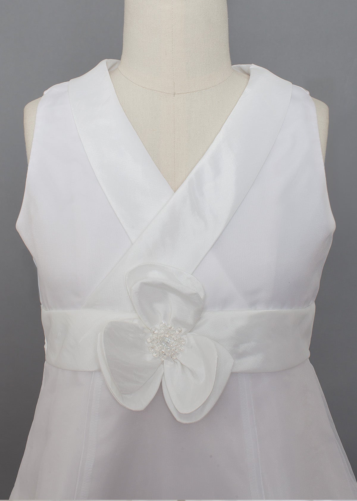 This white communion dress features a luxurious organza overlay with a satin bodice designed in a flattering V-neck crossover style. The waist is accentuated with a satin band adorned with a delicate fabric flower and pearl embellishment. The flowing A-line skirt adds an elegant and refined touch to this design.