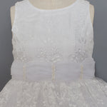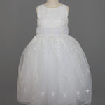 This white communion dress features a beautifully embroidered lace bodice and a full tulle skirt adorned with delicate floral embroidery. The waistband is accented with a soft organza sash, embellished with pearls for an elegant touch. This dress offers a refined and graceful design perfect for her special occasion.