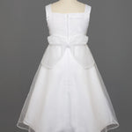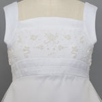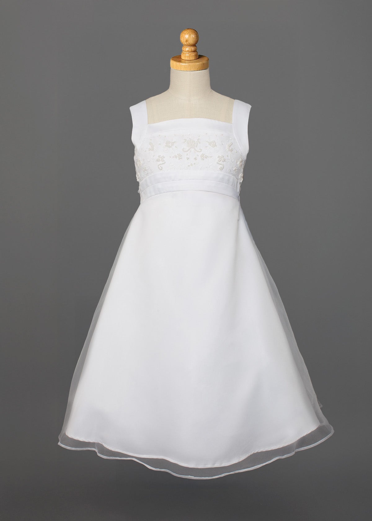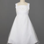 This white communion dress features a satin bodice beautifully embellished with intricate beadwork and floral embroidery. The wide straps provide a secure and elegant fit, while a satin waistband accentuates the design. The skirt is layered with a soft organza overlay, adding a touch of refinement for her special day.