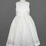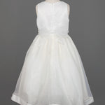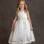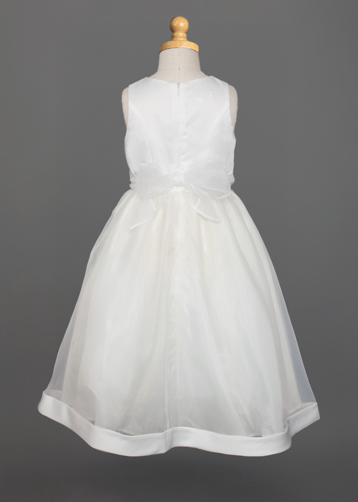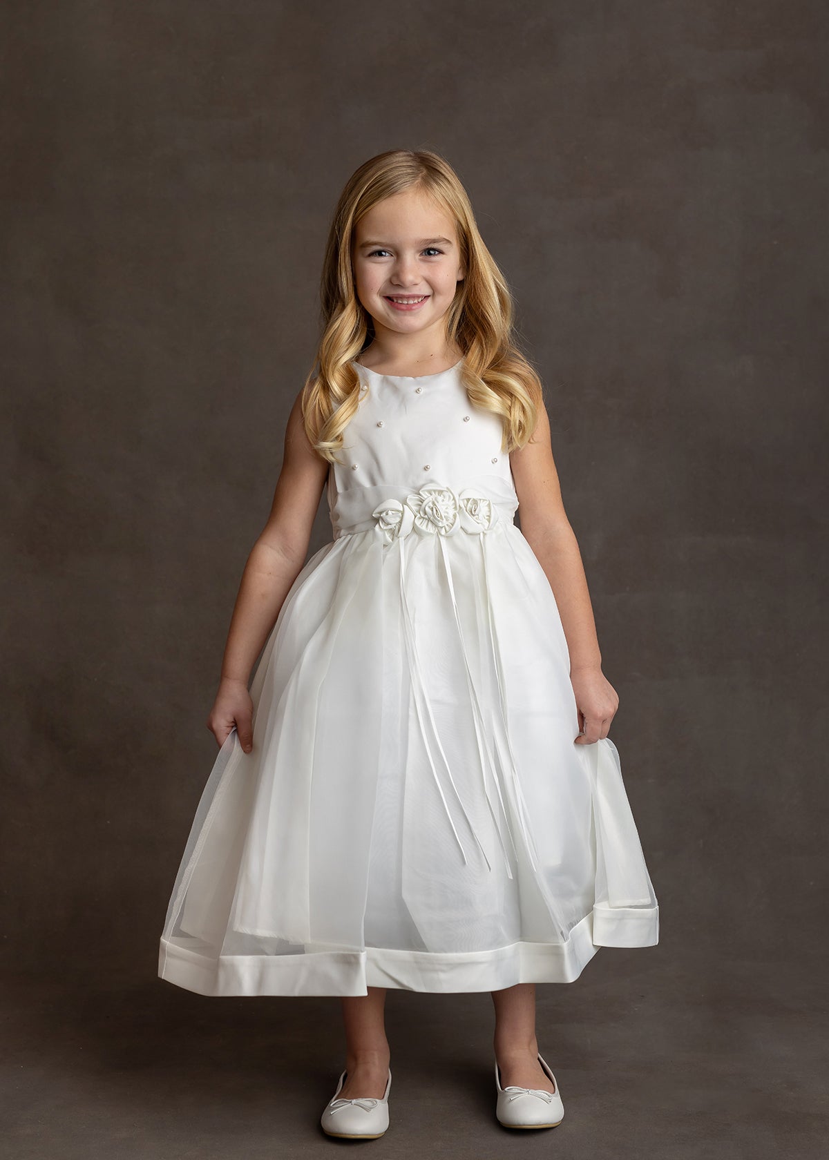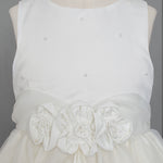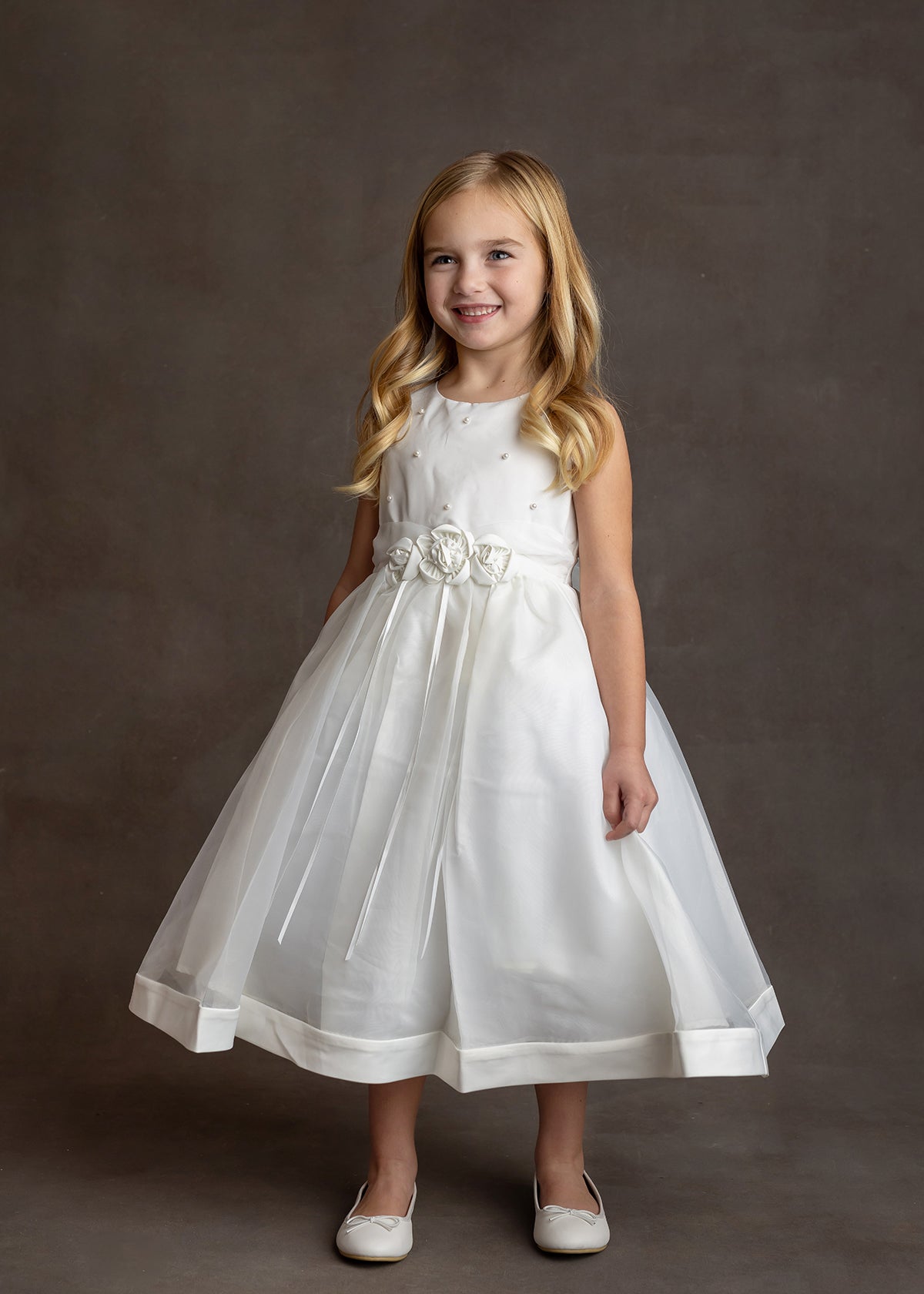 This white communion dress features a sleeveless satin bodice adorned with delicate pearl accents for a subtle touch of elegance. The voluminous tulle skirt is complemented by a wide satin hem and a waistband decorated with intricately crafted satin rosettes and ribbons. Perfect for creating a beautiful and graceful look.