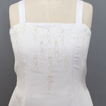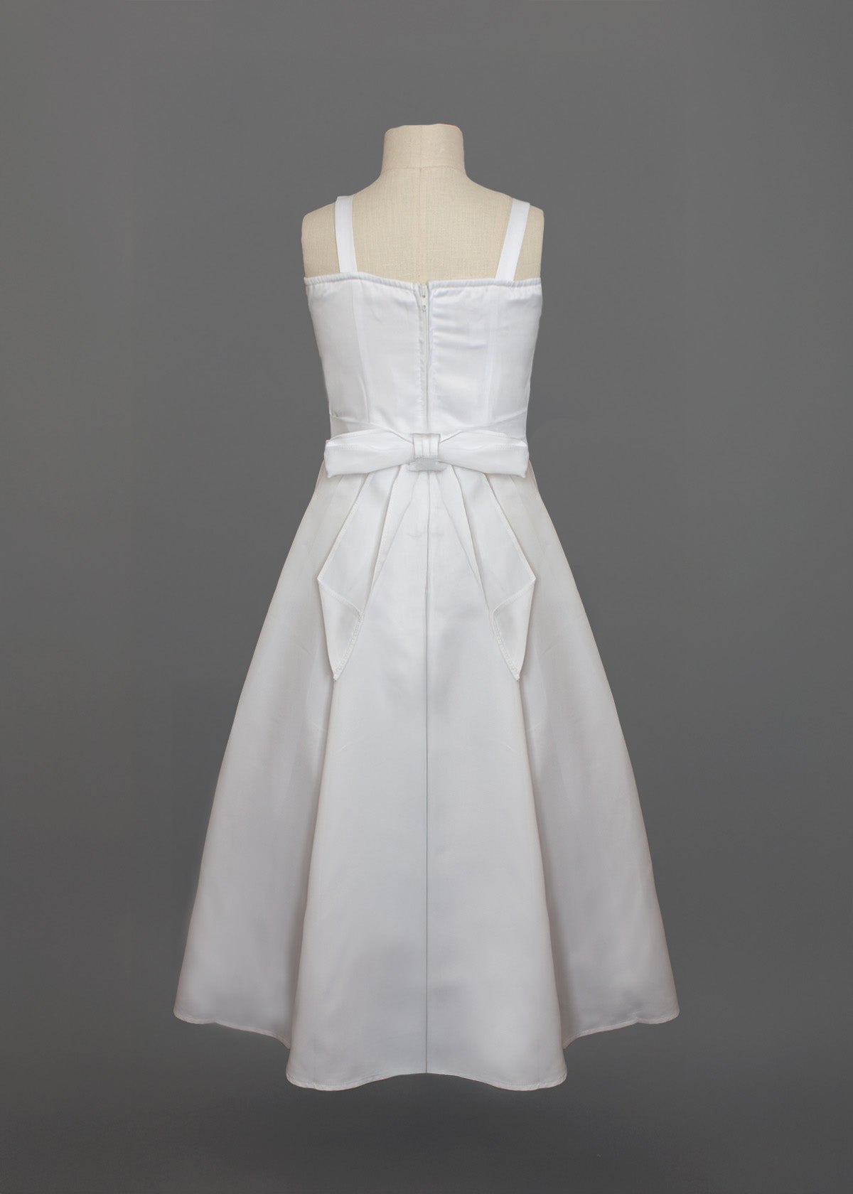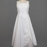 This white communion dress is crafted from a smooth satin fabric, featuring a sleeveless bodice with delicate bead and sequin embellishments for added elegance. The skirt showcases a unique overlapping front panel that reveals a soft tulle layer underneath, creating a graceful and sophisticated design perfect for her special day.