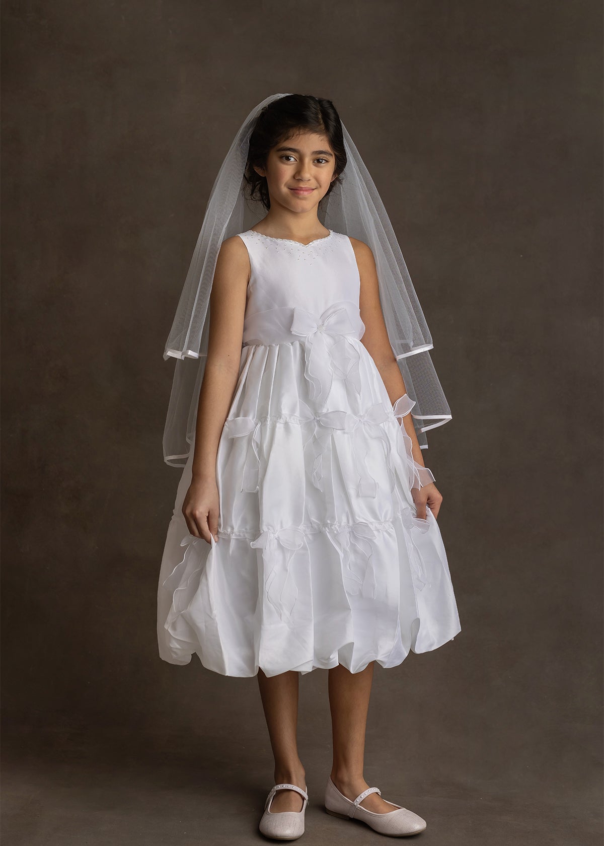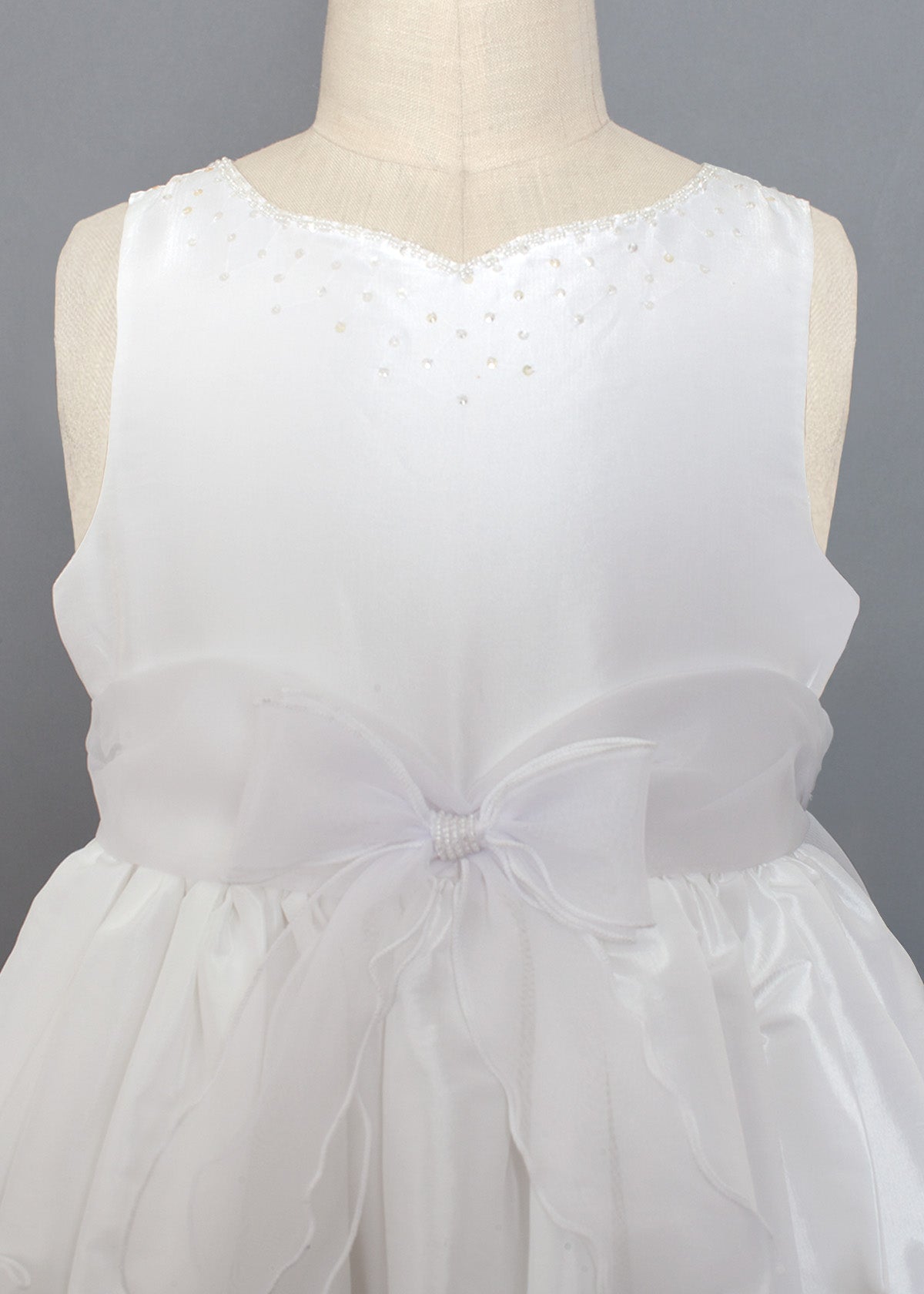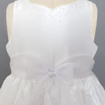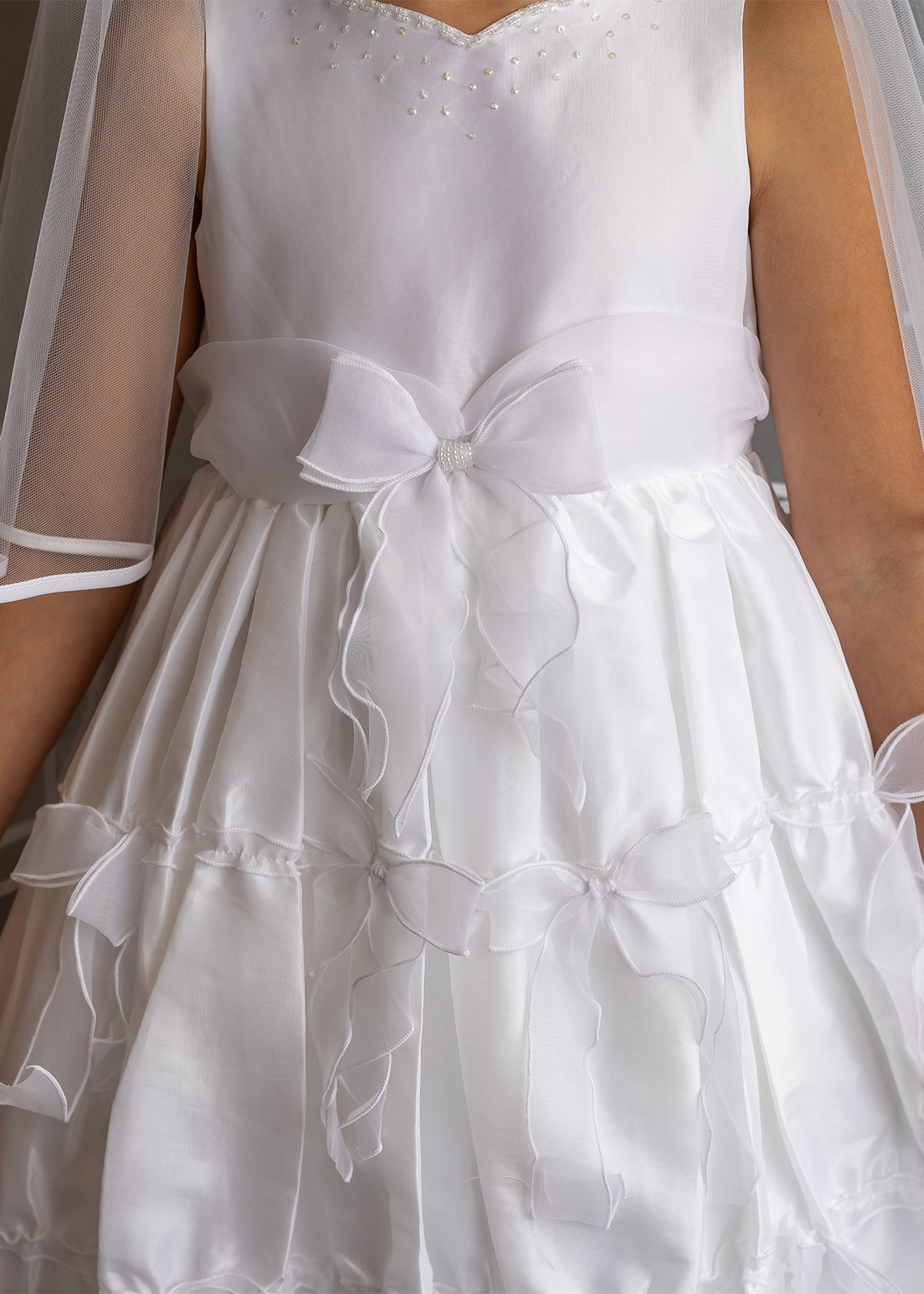 This stunning white communion dress features a glossy satin-like bodice adorned with delicate pearl accents along the neckline. The bubble skirt is beautifully enhanced with sheer organza bows. A wide waistband with a centered bow completes the look, making it perfect for a memorable occasion.