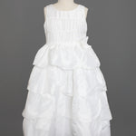 This white communion dress is crafted from lustrous satin and features a ruched bodice with delicate lace accents. The standout detail is the cascading tiered skirt with scalloped layers, creating a graceful and unique design. A floral applique at the waist adds an elegant finishing touch to this special occasion dress.