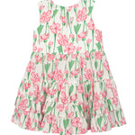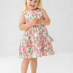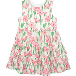 This sleeveless dress features a vibrant pink and green floral print, creating a fresh and playful look. Designed with cascading tiered ruffles, it adds movement and volume to every twirl.