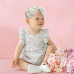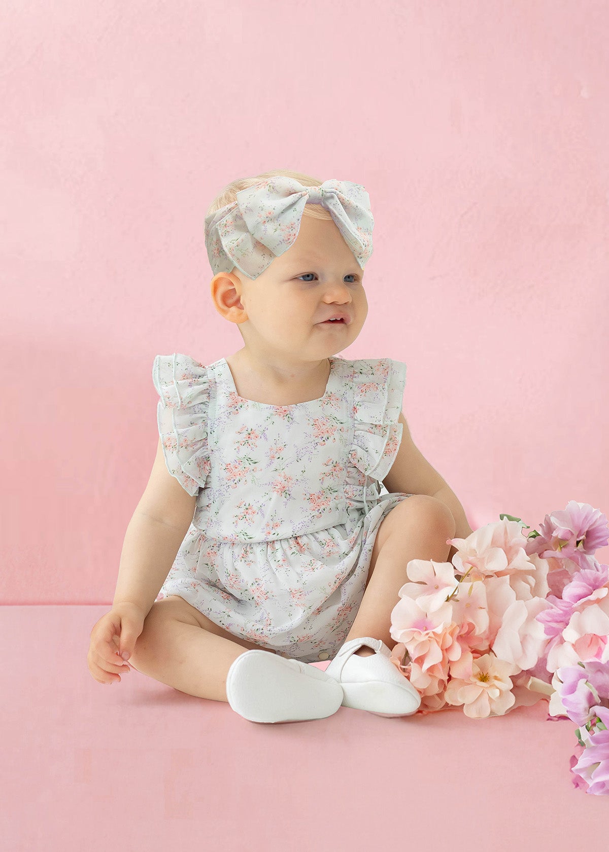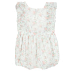 This baby girl romper features a botanical print in soft pastel with shades of pink and blue. The romper is designed with sweet ruffled details in a bubble silhouette.