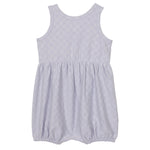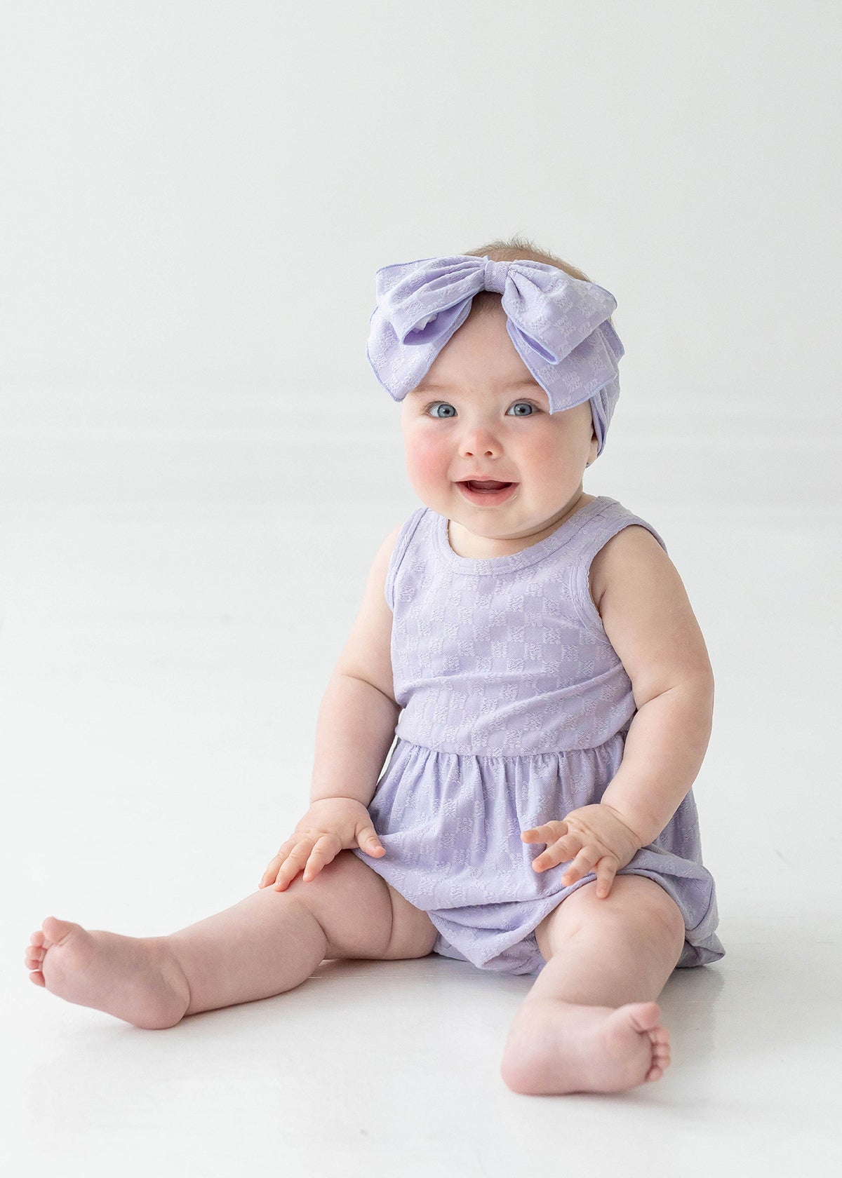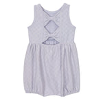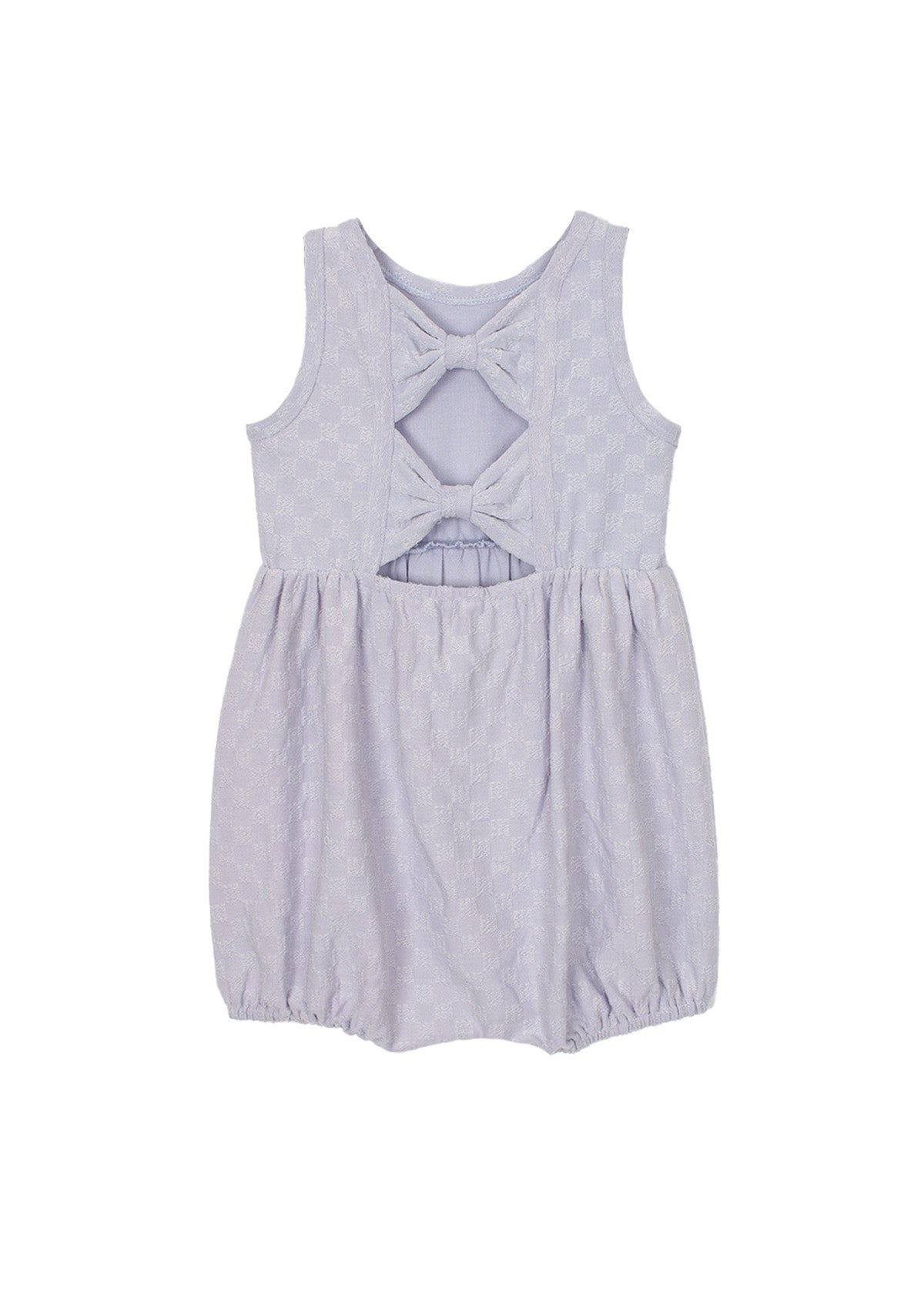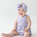 Adorable baby girl's romper in lavender, made from a lightweight terry cloth. The romper features a sleeveless design with a round neckline and bow cutouts on the backside. An outfit perfect for warm weather outings and playtime.