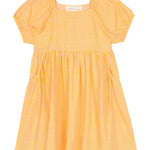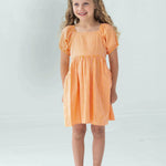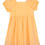 Brighten her wardrobe with this cheerful orange and yellow striped patterned dress. This dress also features short puff sleeves and a gathered waist and side pockets. Perfect for sunny days and playful outings.
