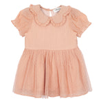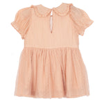 This girls' dress in a soft peach hue features a lightweight fabric with a delicate dotted tulle overlay on the skirt. A ruffled Peter Pan collar and puff sleeves add a vintage-inspired touch, while the gathered waist creates a flowy silhouette. A back button closure ensures easy dressing with timeless style.